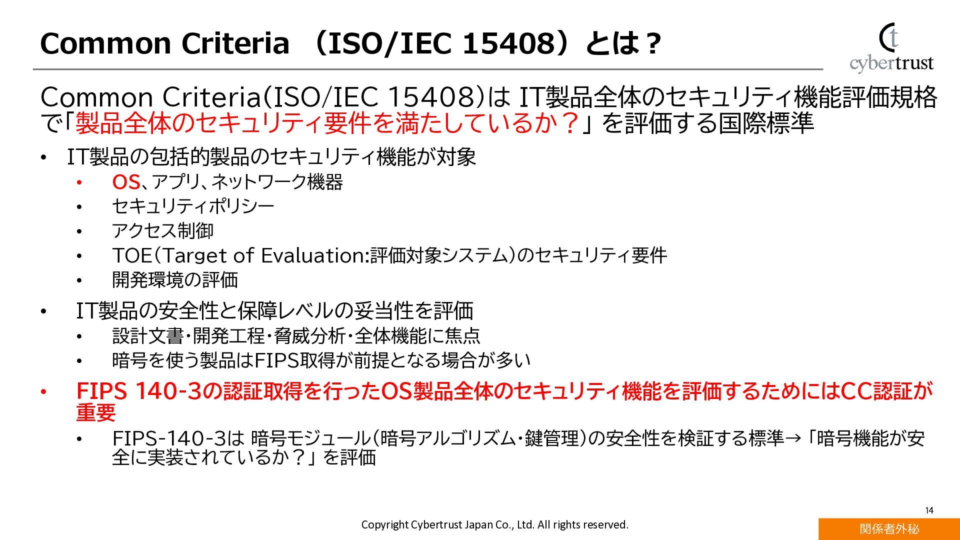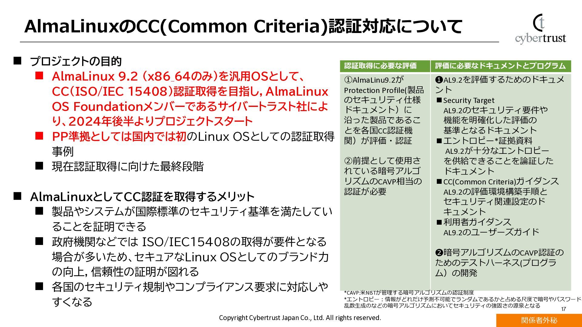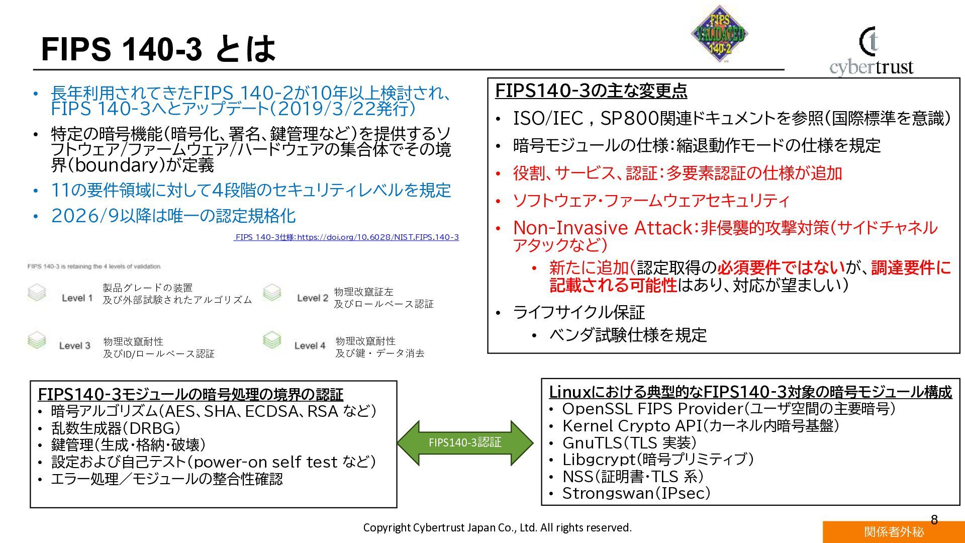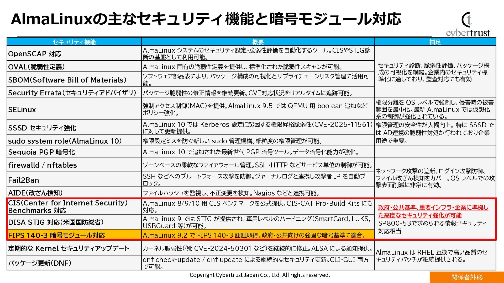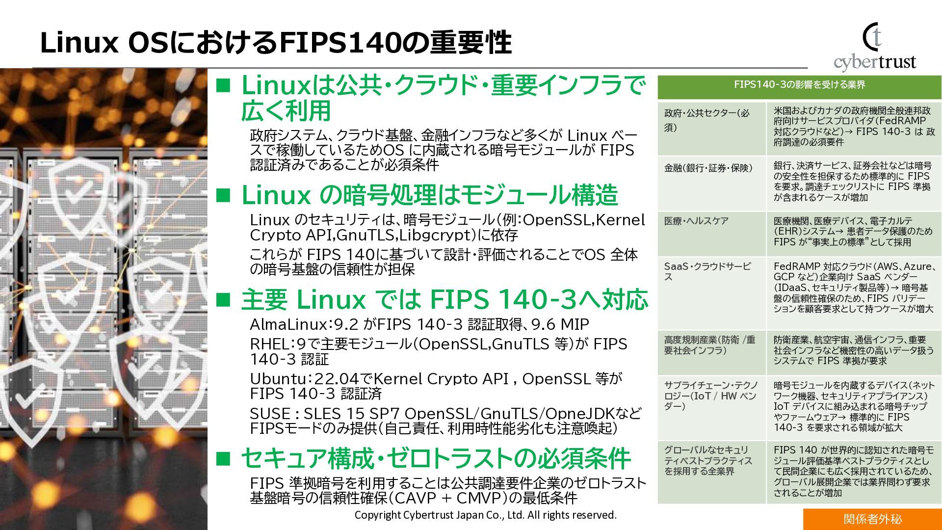 CentOSの後継サーバー用Linux OSとして採用が加速するAlmaLinuxにおいて、エンタープライズ利用で重要視されるセキュリティ機能が注目されています。 AlmaLinuxで対応している国際的な評価・認証規格であるFIPS140-3とCommon Criteria(ISO/IEC15408)認証の概要と取得動向を解説します。