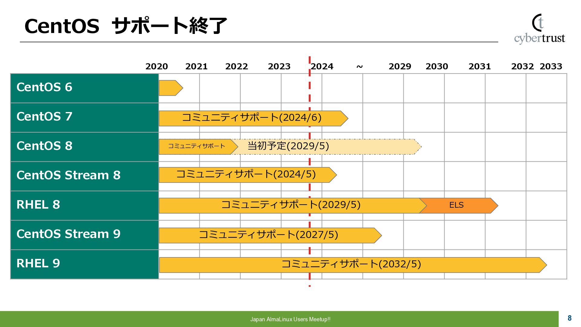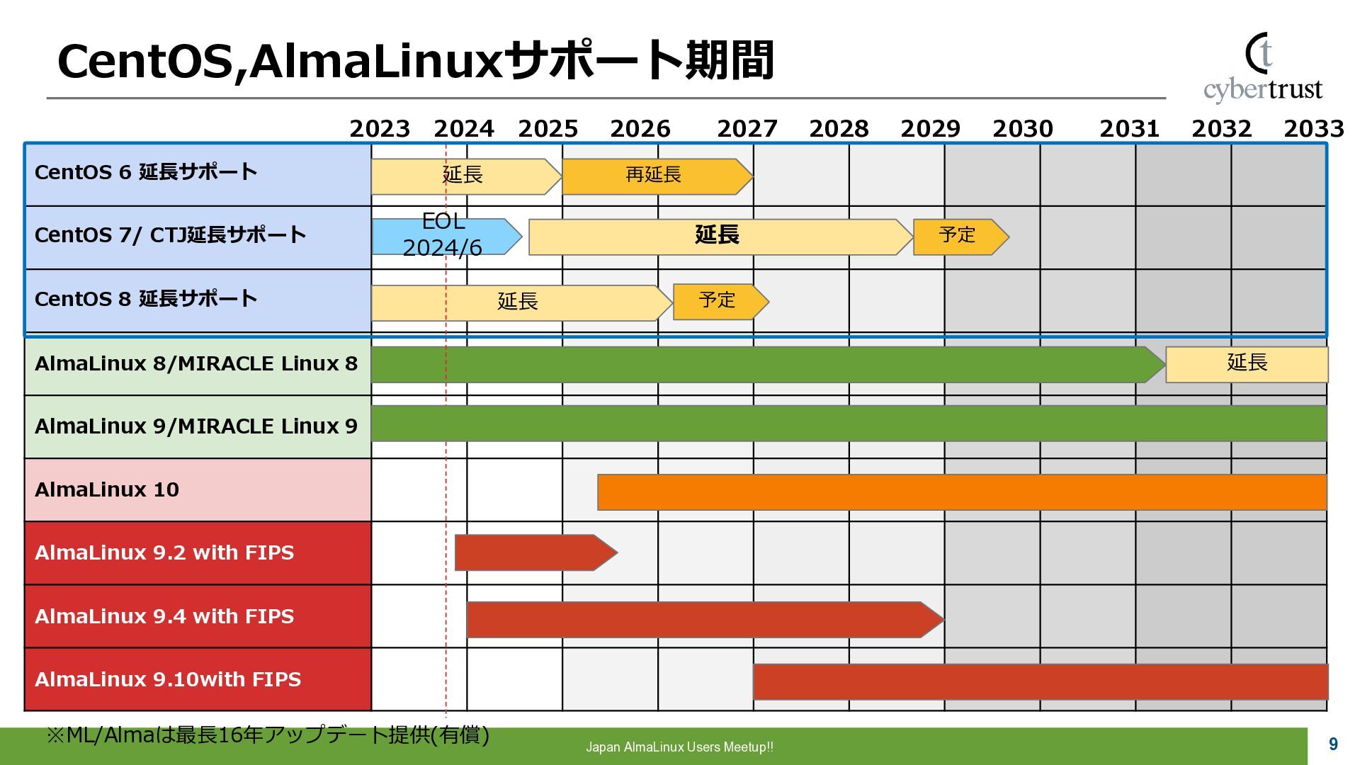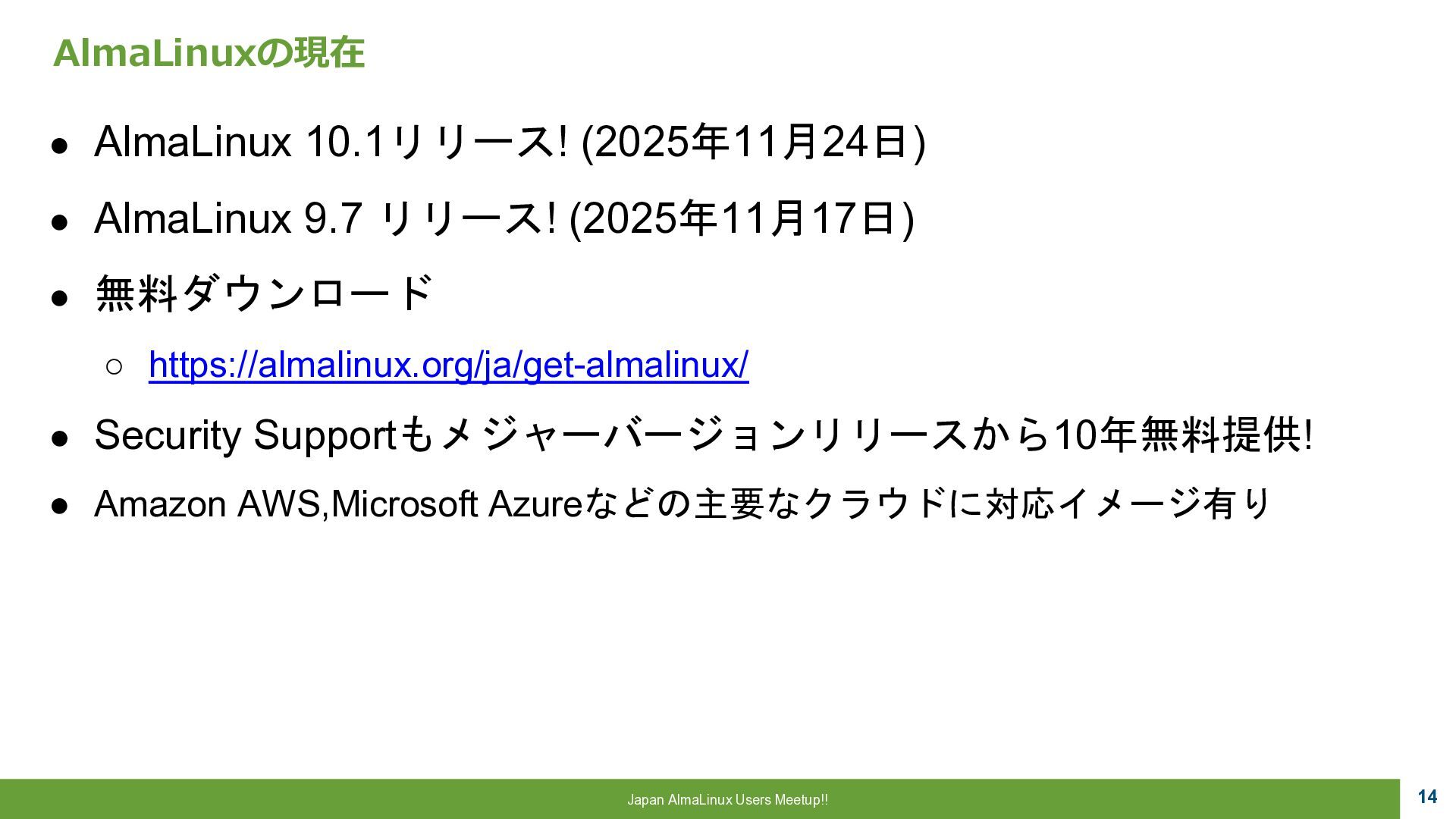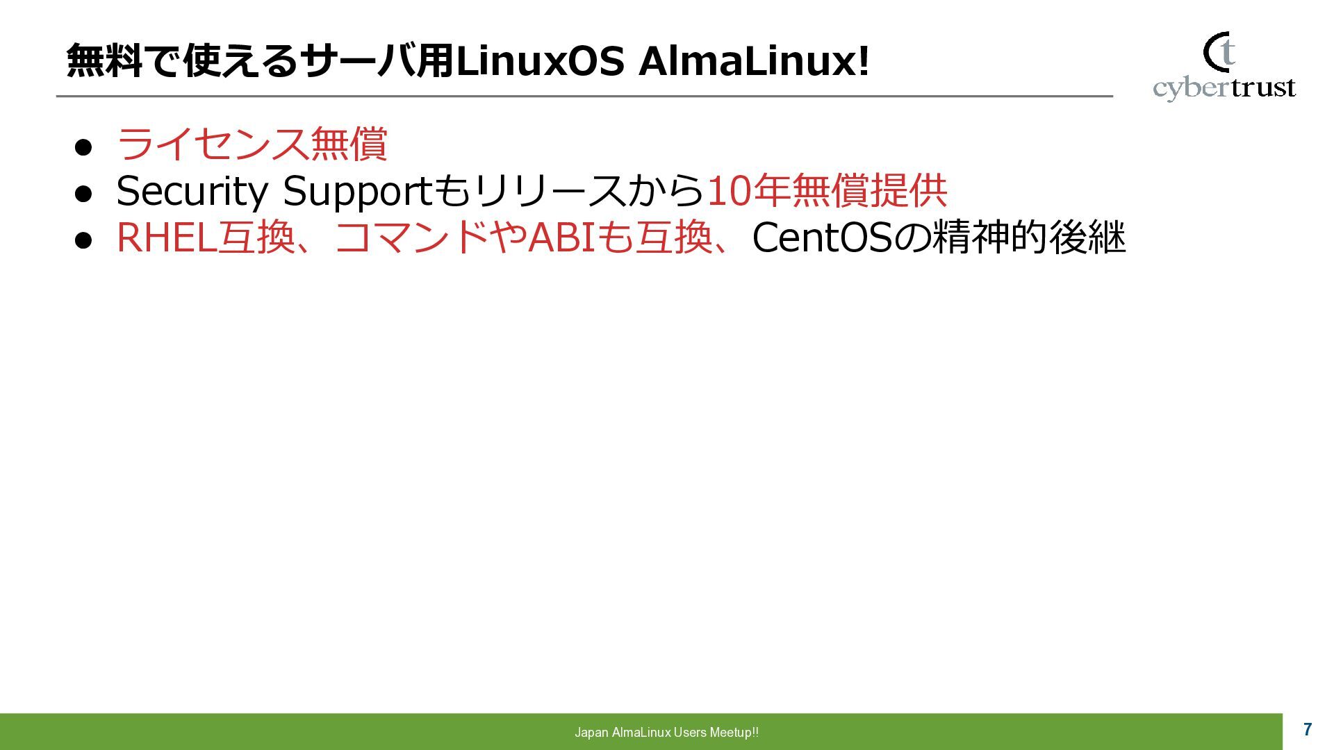 Community 参画 参 画 ビジネス協業 参 画 Foundation、Communityとサイバートラストは AlmaLinuxを共同開発! 企業 ・CloudLinux商材 国内 独占販売権 財団 ・Ptanium Partner ・Board Member Community ・CTJ社2名Full Time Linux Distribution ・MIRACLE LINUX とAlmaLinux統合