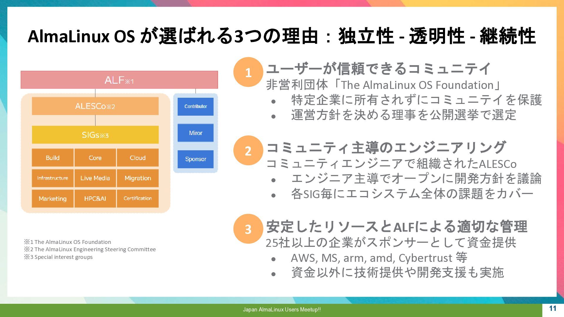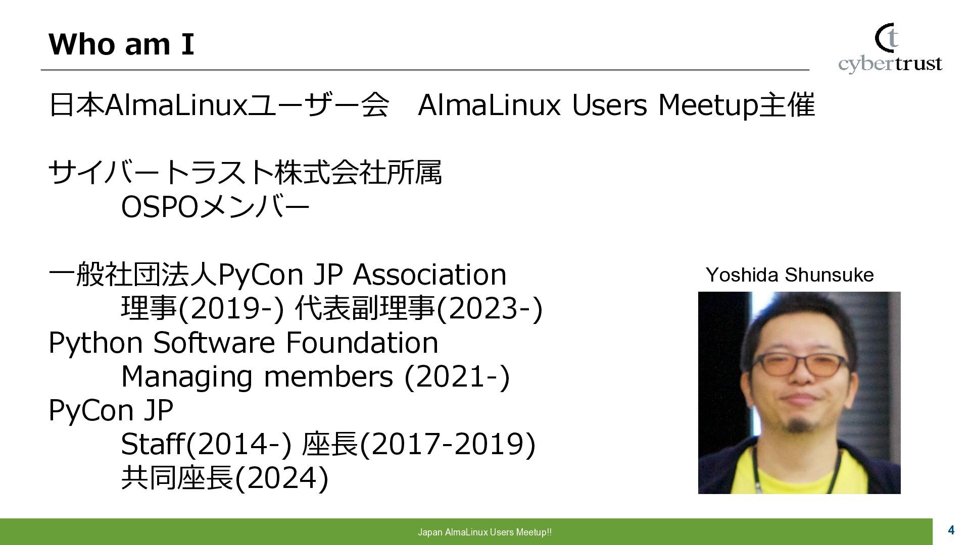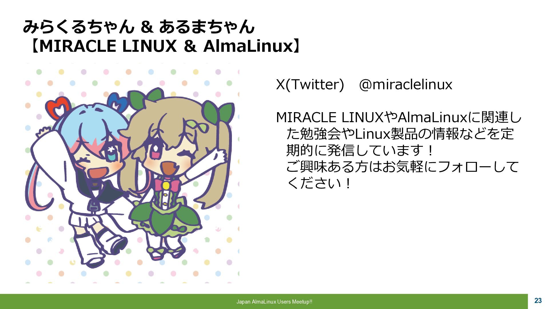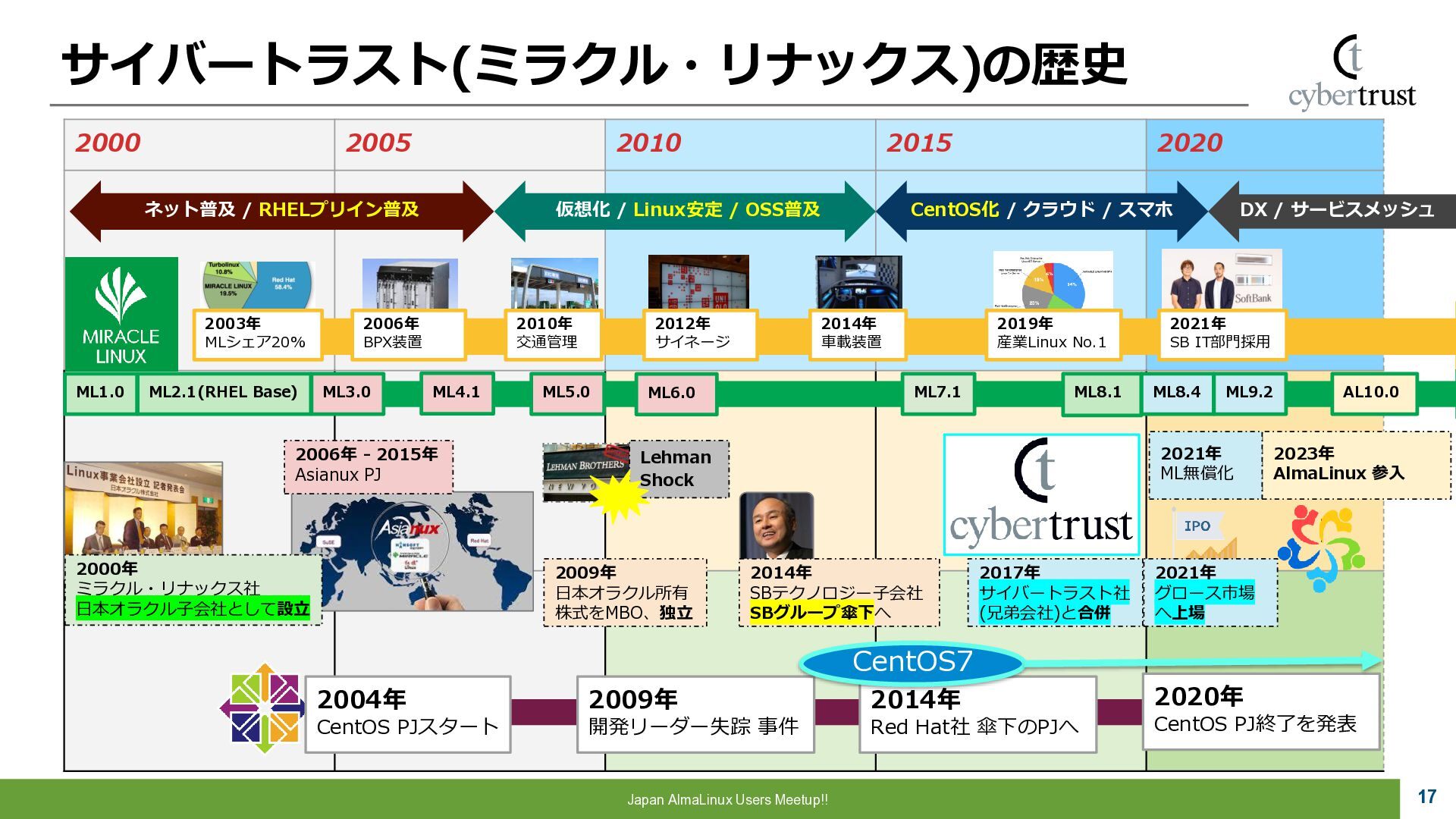 Community 参画 参 画 ビジネス協業 参 画 Foundation、Communityとサイバートラストは AlmaLinuxを共同開発! 企業 ・CloudLinux商材 国内 独占販売権 財団 ・Ptanium Partner ・Board Member Community ・CTJ社2名Full Time Linux Distribution ・MIRACLE LINUX とAlmaLinux統合