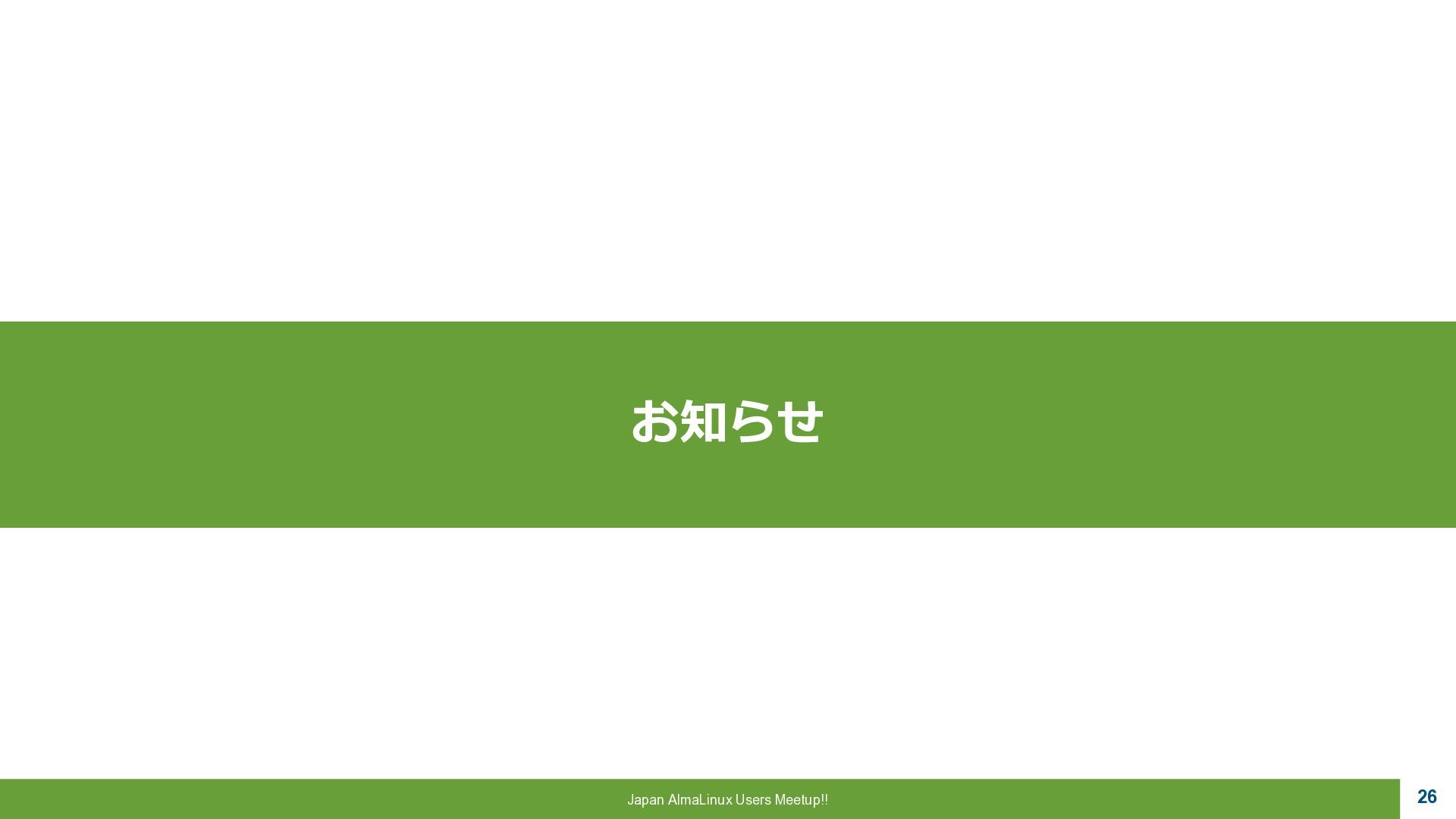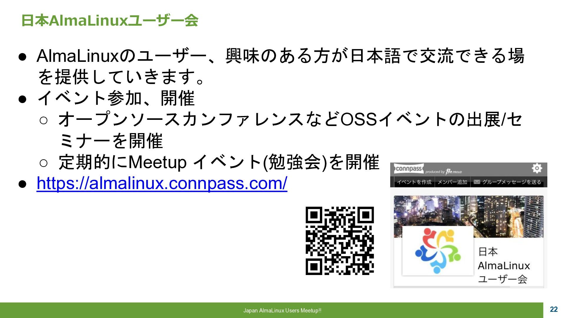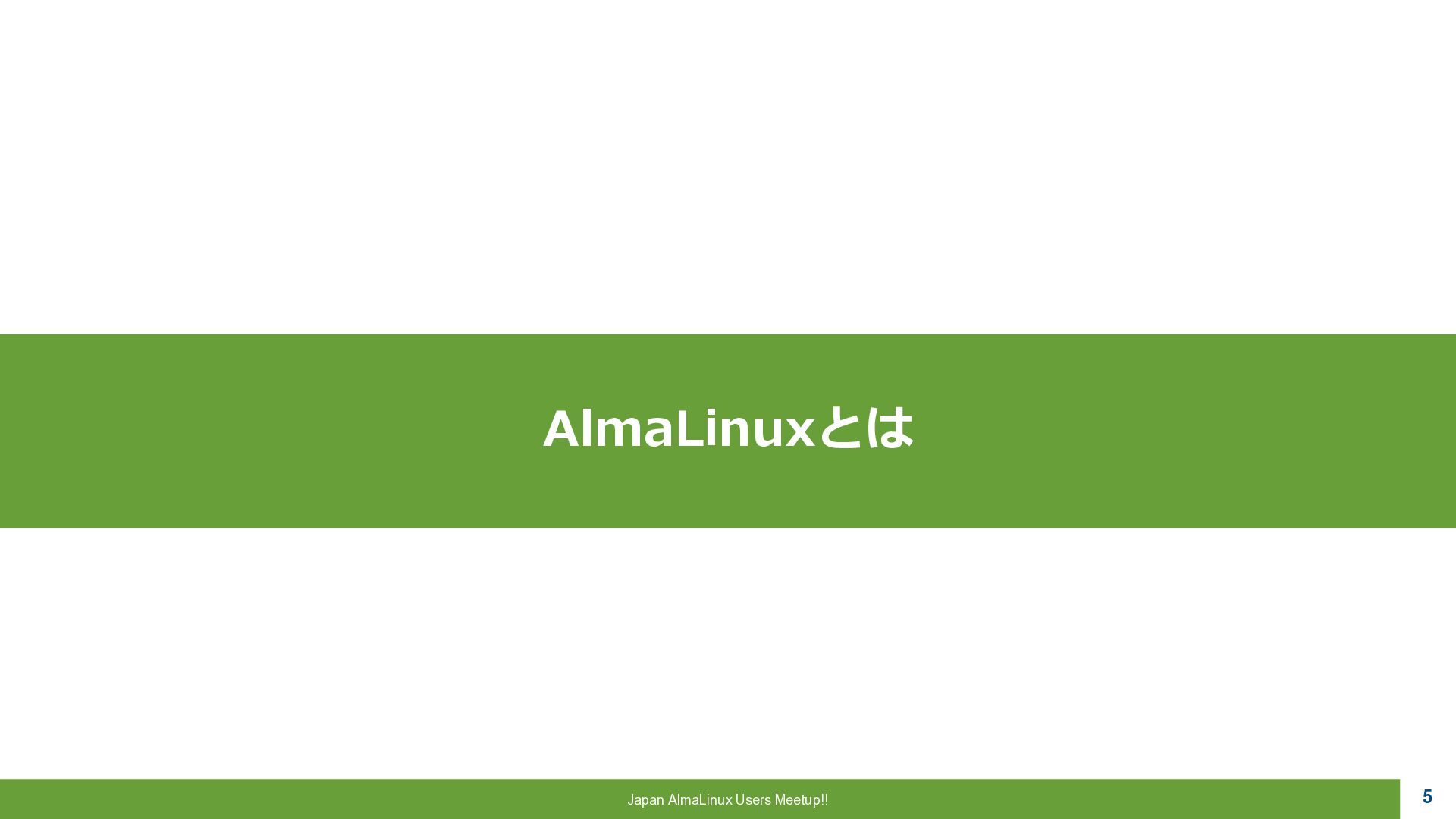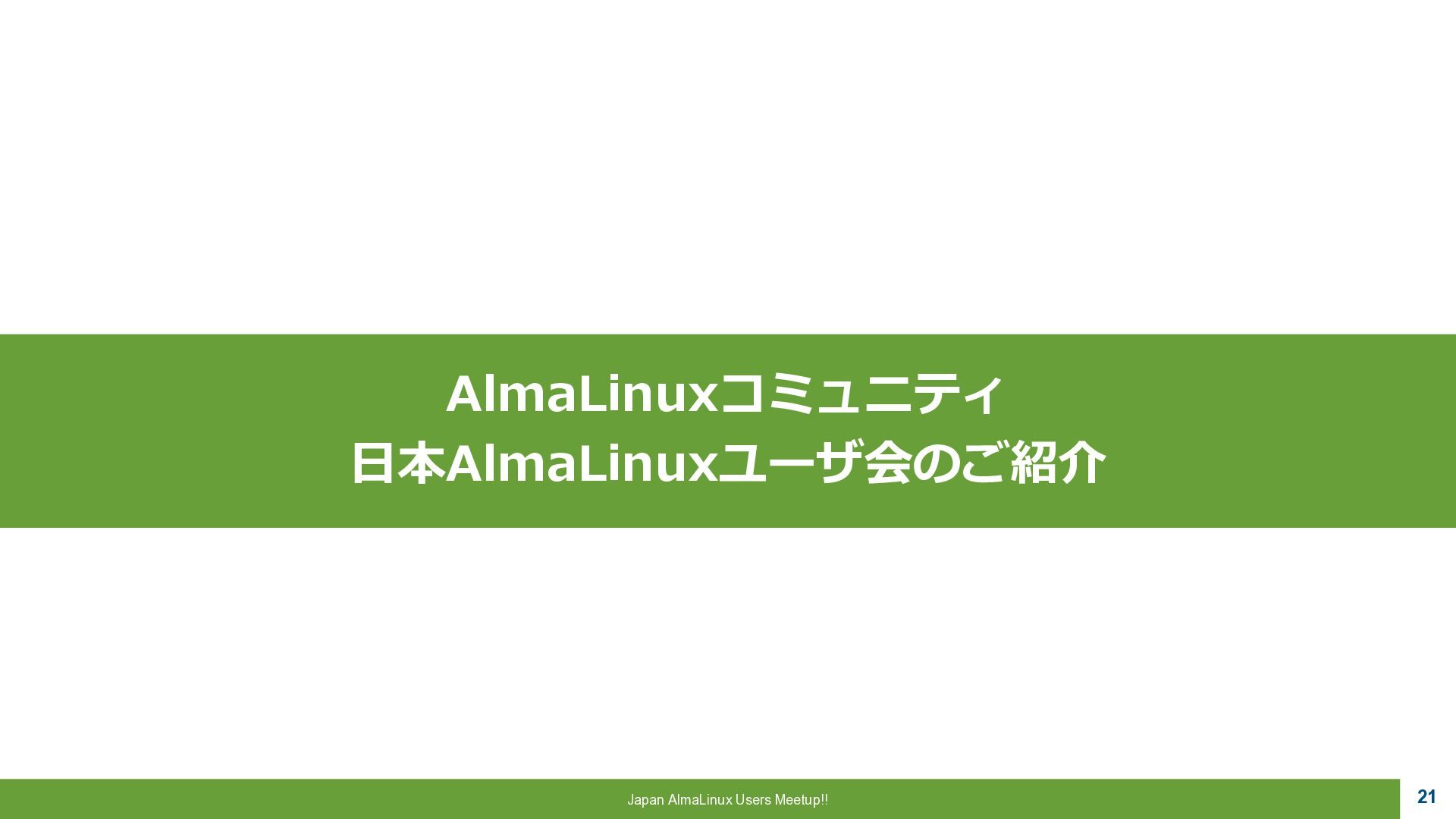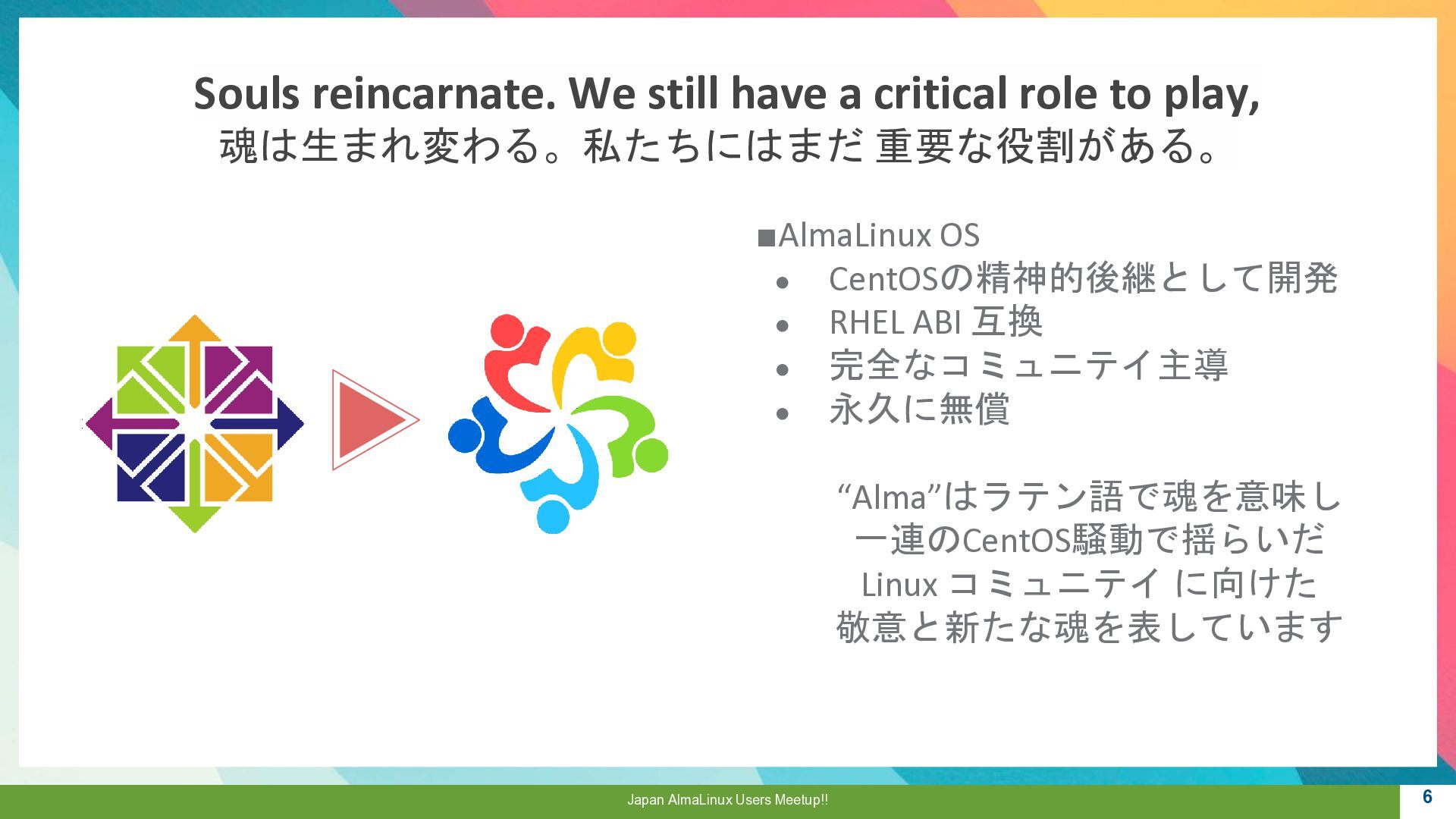 a critical role to play, 魂は生まれ変わる。私たちにはまだ 重要な役割がある。 ▪AlmaLinux OS • CentOSの精神的後継として開発 • RHEL ABI 互換 • 完全なコミュニテイ主導 • 永久に無償 “Alma”はラテン語で魂を意味し 一連のCentOS騒動で揺らいだ Linux コミュニテイ に向けた 敬意と新たな魂を表しています