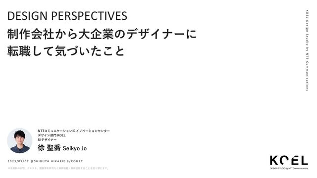 KOEL UIデザイナー DESIGN PERSPECTIVES 2 0 2 3 / 0 9 / 0 7 @ S H I B U Y A H I K A R I E 8 / C O U R T K O E L D e s i g n S t u d i o b y N T T C o m m u n i c a t i o n s ※本資料の内容、テキスト、画像等を許可なく無断転載・無断使用することを固く禁じます。