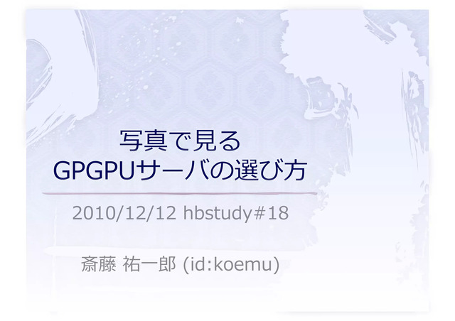 hbstudy#18 LT スライド。 GPGPU サーバの立ち上げを初めて見ようとされている方向けのハード選定のコツを解説。 詳細はブログにて。 http://www.koemu.com/blog/2010/12/12/hbstudy18/