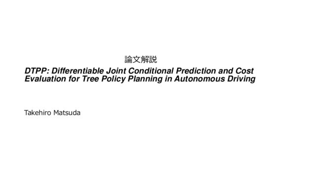 Presentation for explaining the paper "DTPP: Differentiable Joint Conditional Prediction and Cost Evaluationfor Tree Policy Planning in Autonomous Driving" presented from Nanyang Technological University, NVIDIA and Stanford University.