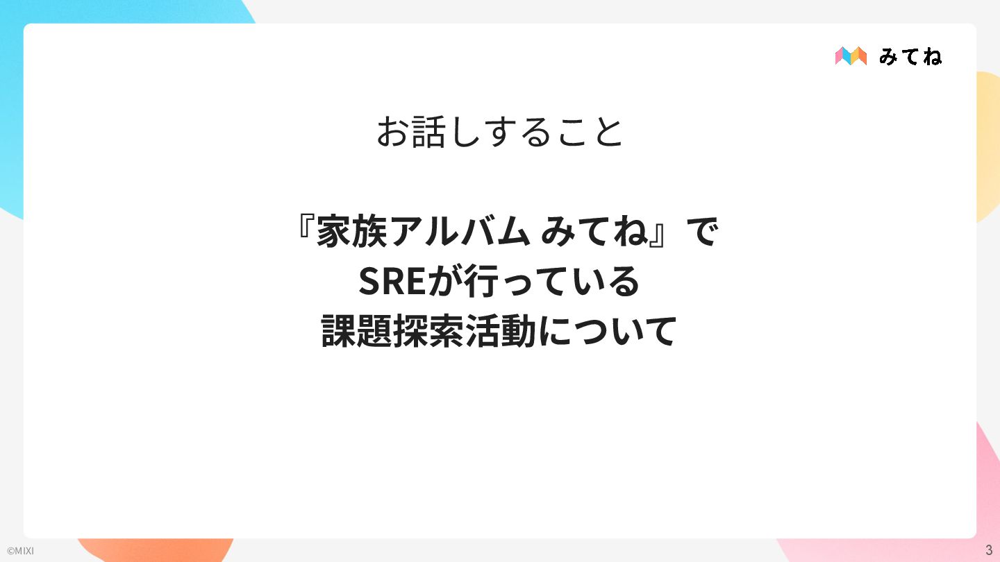 3 ©MIXI お話しすること 『家族アルバム みてね』で SREが⾏っている 課題探索活動について