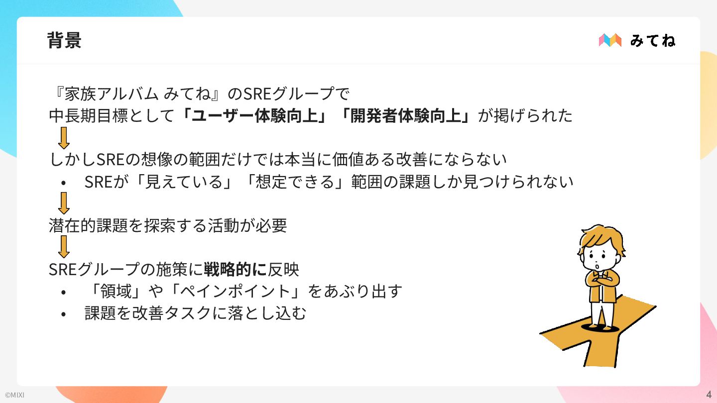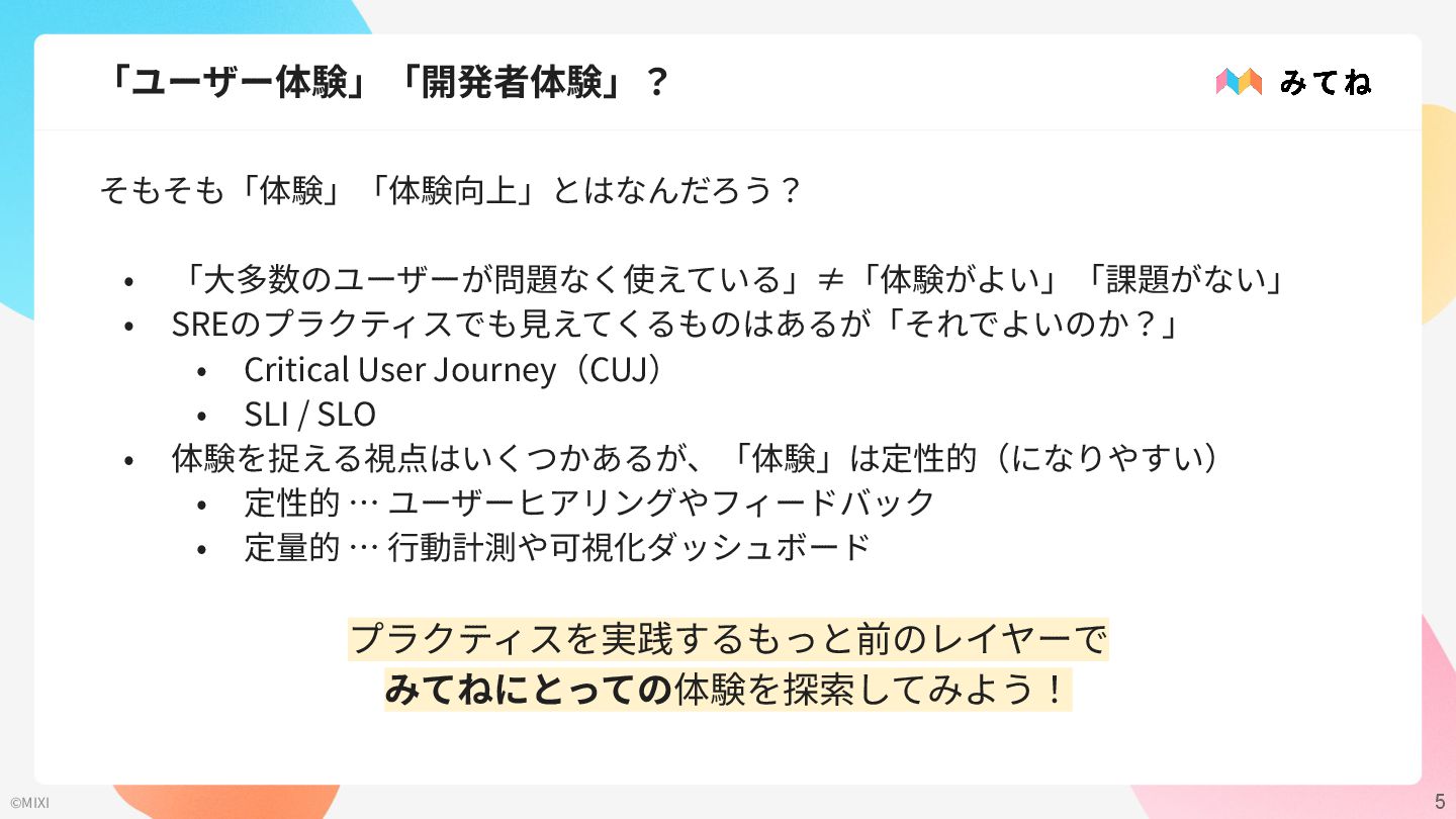 4 ©MIXI 背景 『家族アルバム みてね』のSREグループで 中⻑期⽬標として「ユーザー体験向上」「開発者体験向上」が掲げられた しかしSREの想像の範囲だけでは本当に価値ある改善にならない • SREが「⾒えている」「想定できる」範囲の課題しか⾒つけられない 潜在的課題を探索する活動が必要