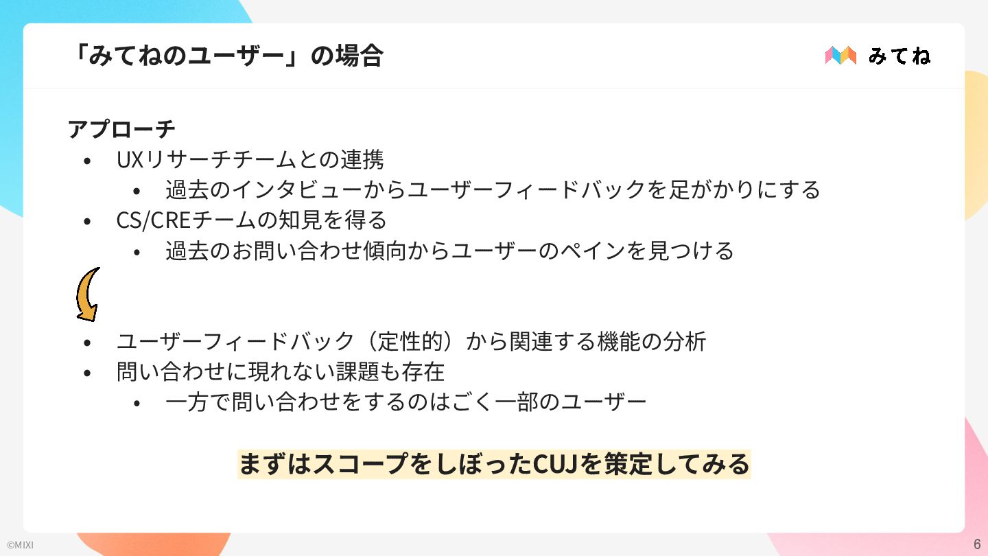 • 過去のお問い合わせ傾向からユーザーのペインを⾒つける • ユーザーフィードバック(定性的)から関連する機能の分析 • 問い合わせに現れない課題も存在 • ⼀⽅で問い合わせをするのはごく⼀部のユーザー まずはスコープをしぼったCUJを策定してみる