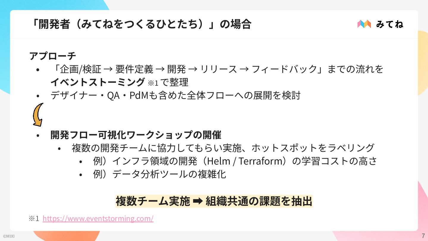 → リリース → フィードバック」までの流れを イベントストーミング ※1 で整理 • デザイナー‧QA‧PdMも含めた全体フローへの展開を検討 • 開発フロー可視化ワークショップの開催 • 複数の開発チームに協⼒してもらい実施、ホットスポットをラベリング • 例)インフラ領域の開発(Helm / Terraform)の学習コストの⾼さ • 例)データ分析ツールの複雑化 複数チーム実施 ➡ 組織共通の課題を抽出 ※1 https://www.eventstorming.com/