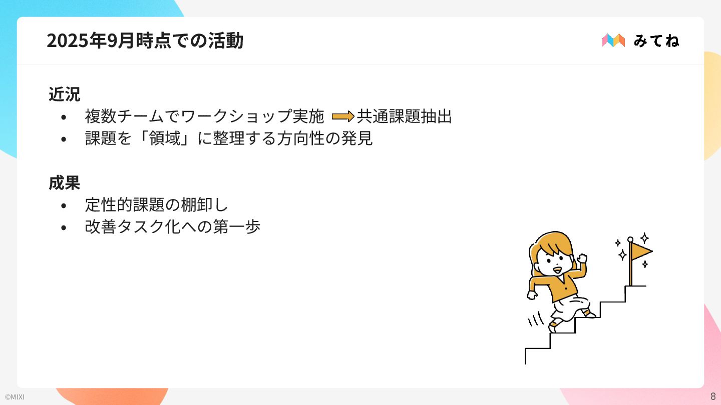 8 ©MIXI 2025年9⽉時点での活動 近況 • 複数チームでワークショップ実施 共通課題抽出 • 課題を「領域」に整理する⽅向性の発⾒ 成果