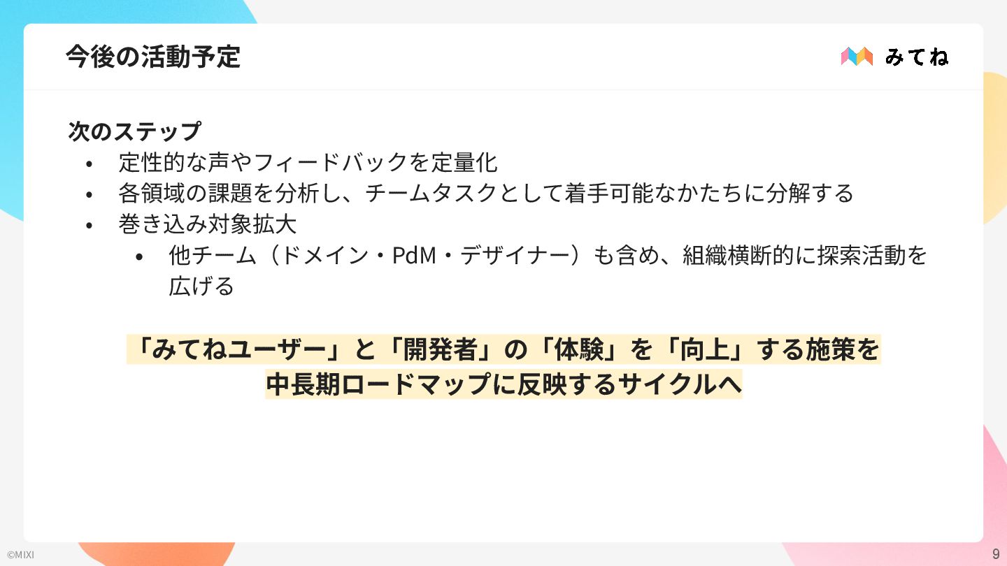9 ©MIXI 今後の活動予定 次のステップ • 定性的な声やフィードバックを定量化 • 各領域の課題を分析し、チームタスクとして着⼿可能なかたちに分解する • 巻き込み対象拡⼤