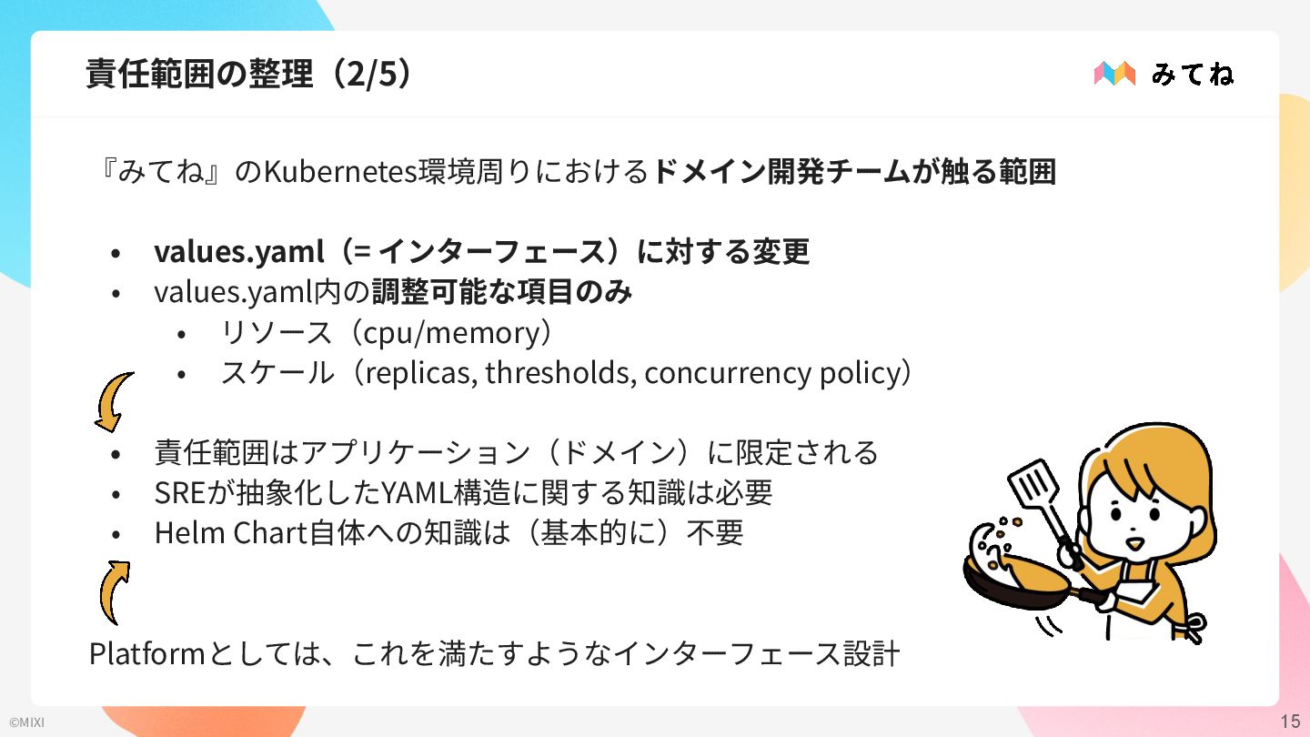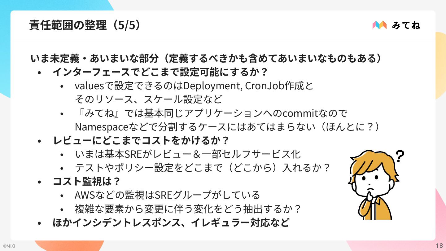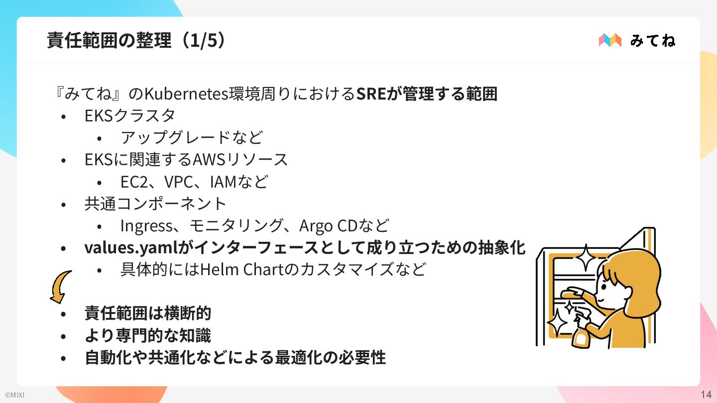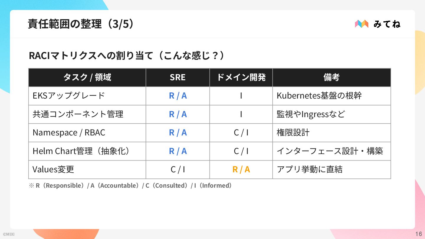 EKSアップグレード R / A I Kubernetes基盤の根幹 共通コンポーネント管理 R / A I 監視やIngressなど Namespace / RBAC R / A C / I 権限設計 Helm Chart管理(抽象化) R / A C / I インターフェース設計‧構築 Values変更 C / I R / A アプリ挙動に直結 ※ R(Responsible)/ A(Accountable)/ C(Consulted)/ I(Informed)