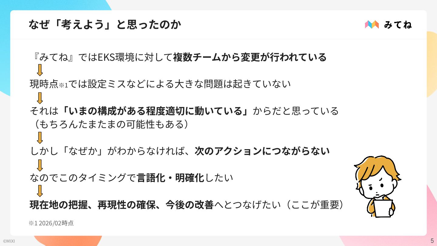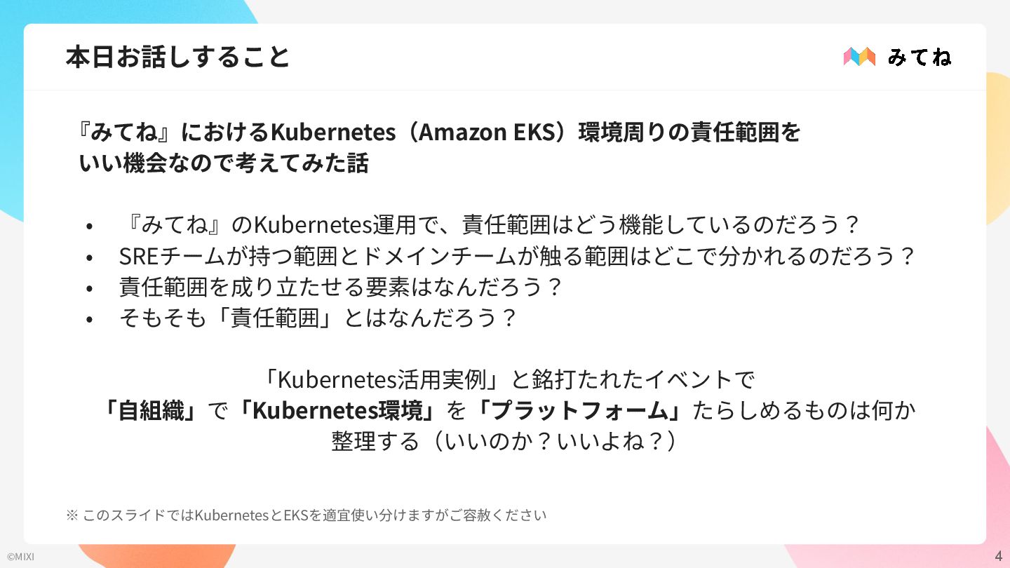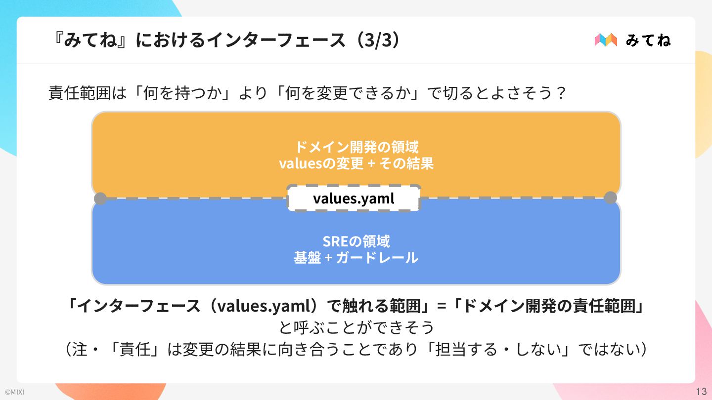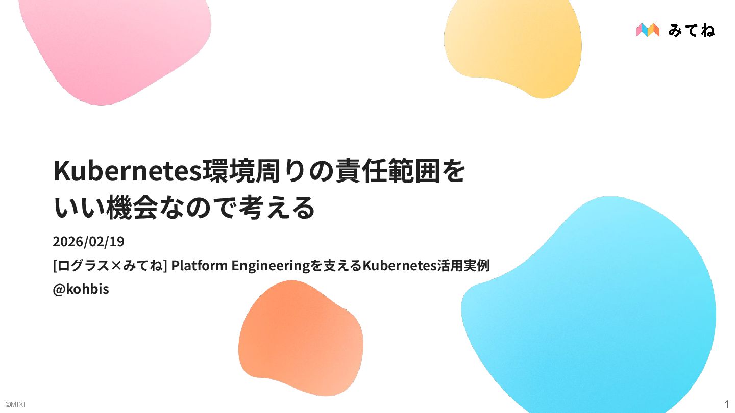 EKSアップグレード R / A I Kubernetes基盤の根幹 共通コンポーネント管理 R / A I 監視やIngressなど Namespace / RBAC R / A C / I 権限設計 Helm Chart管理(抽象化) R / A C / I インターフェース設計‧構築 Values変更 C / I R / A アプリ挙動に直結 ※ R(Responsible)/ A(Accountable)/ C(Consulted)/ I(Informed)