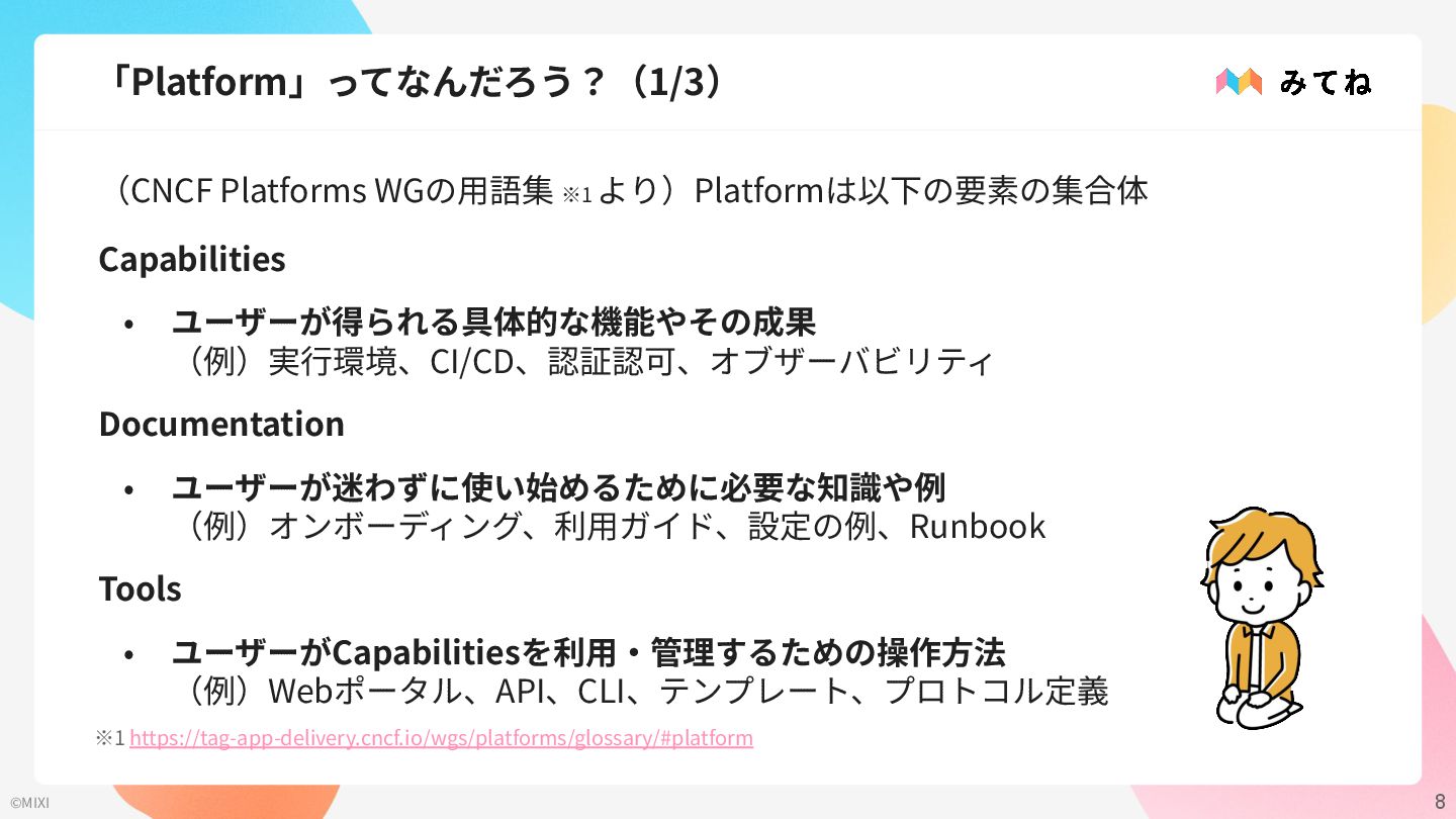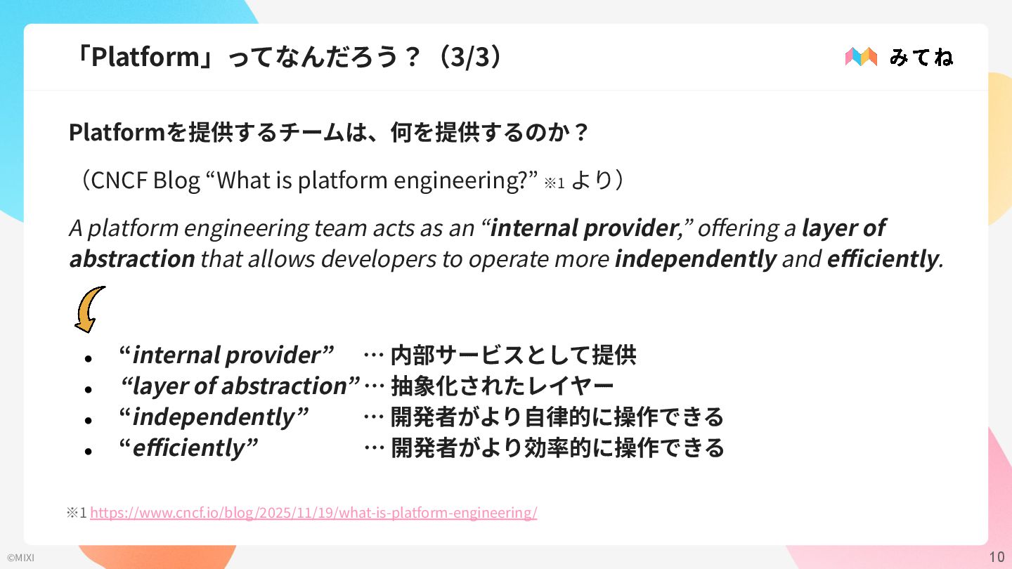 ※1 より) A platform engineering team acts as an “internal provider,” offering a layer of abstraction that allows developers to operate more independently and efficiently. • “internal provider” … 内部サービスとして提供 • “layer of abstraction” … 抽象化されたレイヤー • “independently” … 開発者がより⾃律的に操作できる • “efficiently” … 開発者がより効率的に操作できる ※1 https://www.cncf.io/blog/2025/11/19/what-is-platform-engineering/