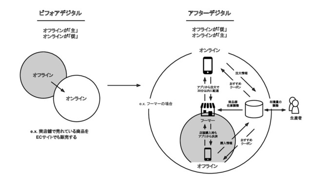 ビフォアデジタル アフターデジタル オフライン オンライン オフラインが「主」 オンラインが「従」 オンライン e.x. 実店舗で売れている商品を ECサイトでも販売する