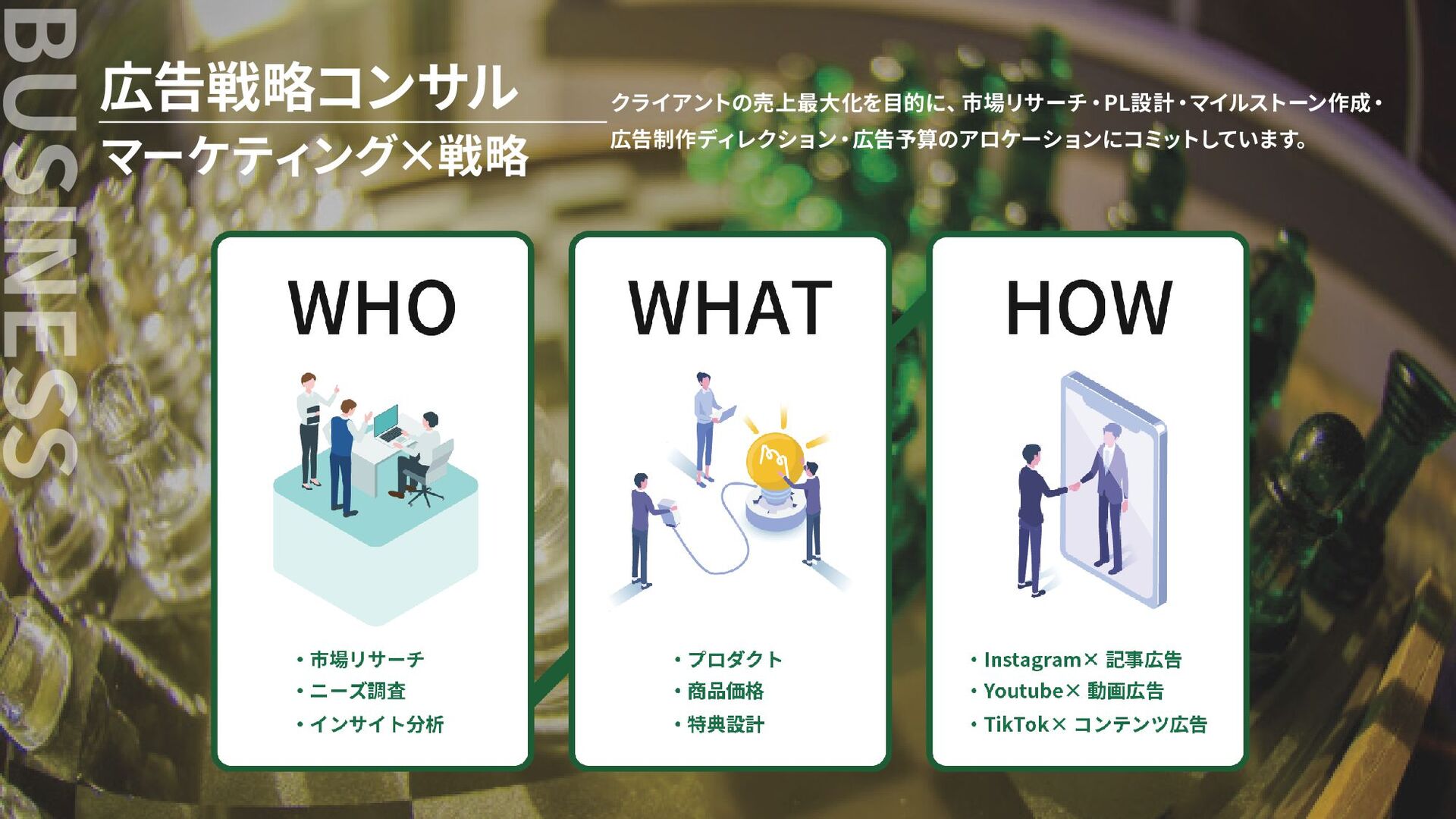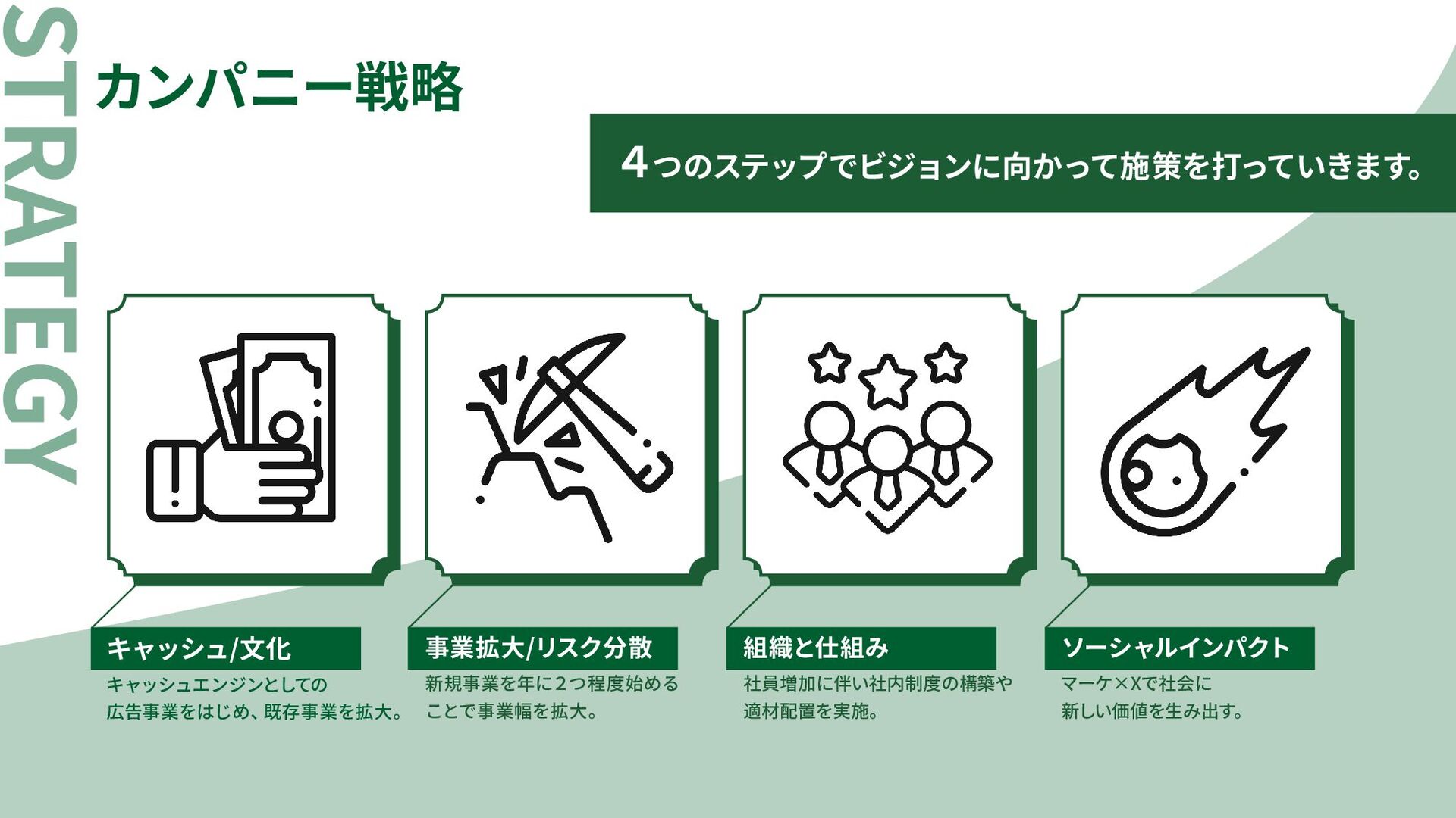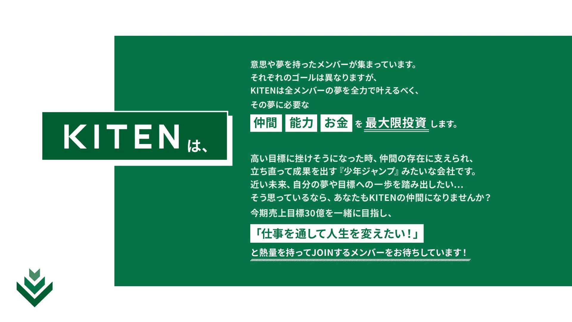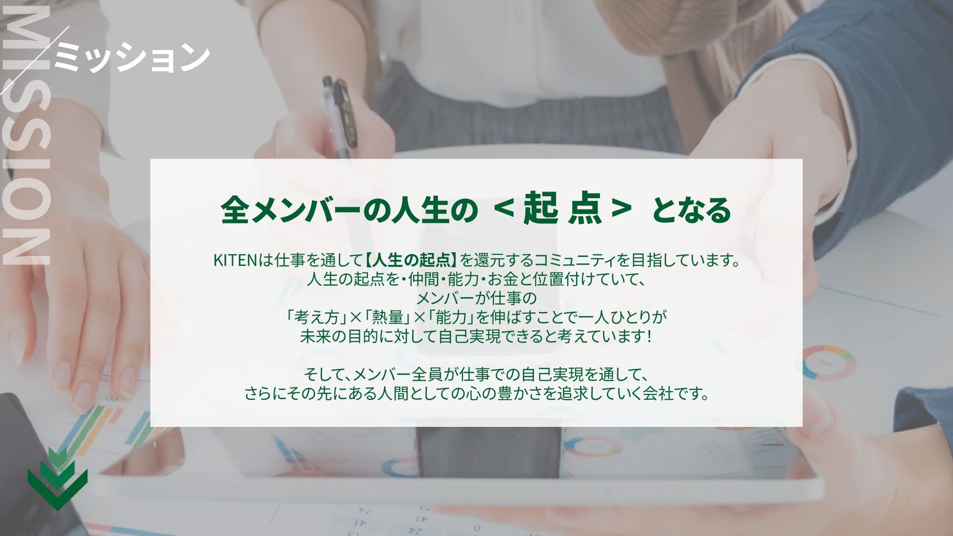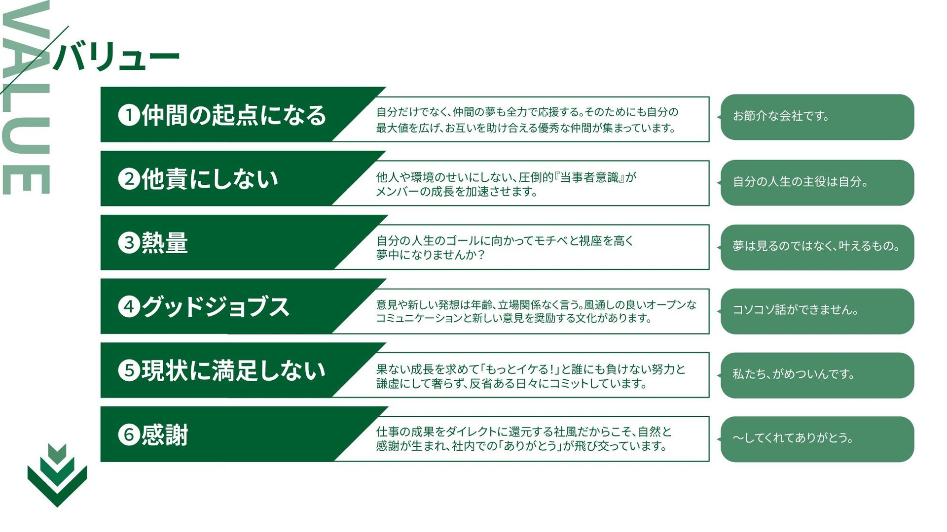 圧倒的 『当事者意識』 が メンバーの成長を加速させます。 自分の人生のゴールに向かってモチベと視座を高く 夢中になりませんか? 意見や新しい発想は年齢、 立場関係なく言う。 風通しの良いオープンな コミュニケーションと新しい意見を奨励する文化があります。 果ない成長を求めて 「もっとイケる ! 」 と誰にも負けない努力と 謙虚にして奢らず、 反省ある日々にコミ ッ トしています。 仕事の成果をダイレク トに還元する社風だからこそ、 自然と 感謝が生まれ、 社内での 「ありがとう」 が飛び交っています。 夢は見るのではなく、 叶えるもの。 〜して くれてありがとう。 自分の人生の主役は自分。 私たち、 がめついんです。 お節介な会社です。 コソコソ話ができません。 ❶仲間の起点になる ❷他責にしない ❸熱量 ❹グッドジョブス ❺現状に満足しない ❻感謝