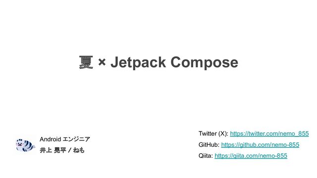 夏 × Jetpack Compose Twitter (X): https://twitter.com/nemo_855 GitHub: https://github.com/nemo-855 Qiita: