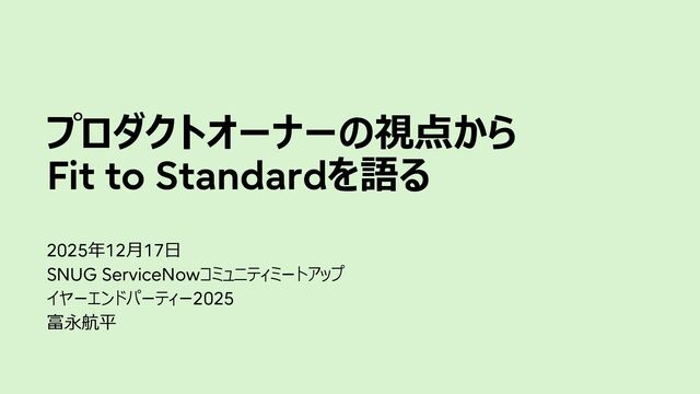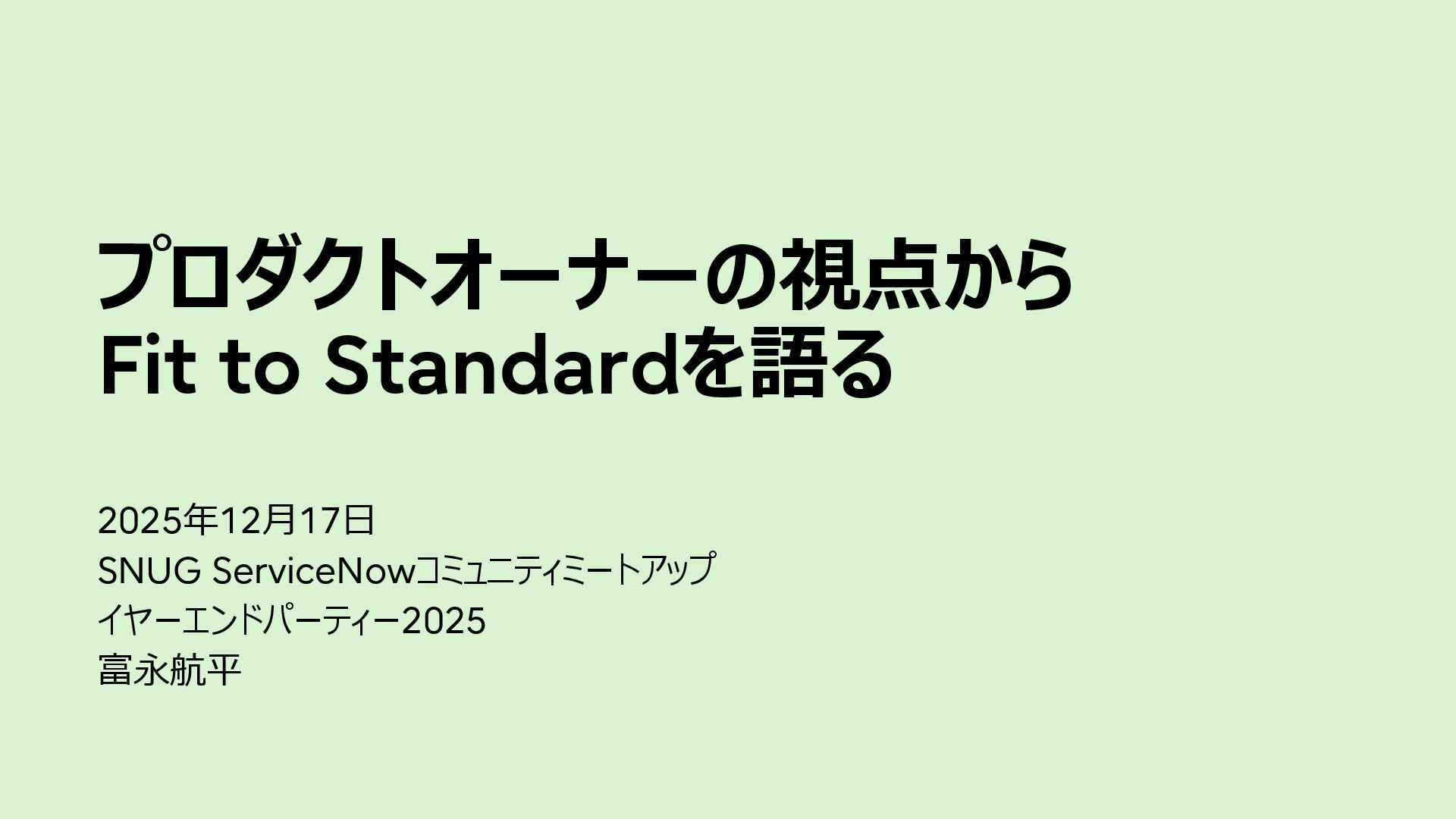 プロダクトオーナーの視点から Fit to Standardを語る 2025年12月17日 SNUG ServiceNowコミュニティミートアップ イヤーエンドパーティー2025 富永航平