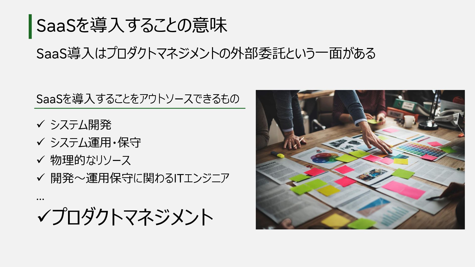 ✓プロダクトマネジメント SaaS導入はプロダクトマネジメントの外部委託という一面がある SaaSを導入することをアウトソースできるもの