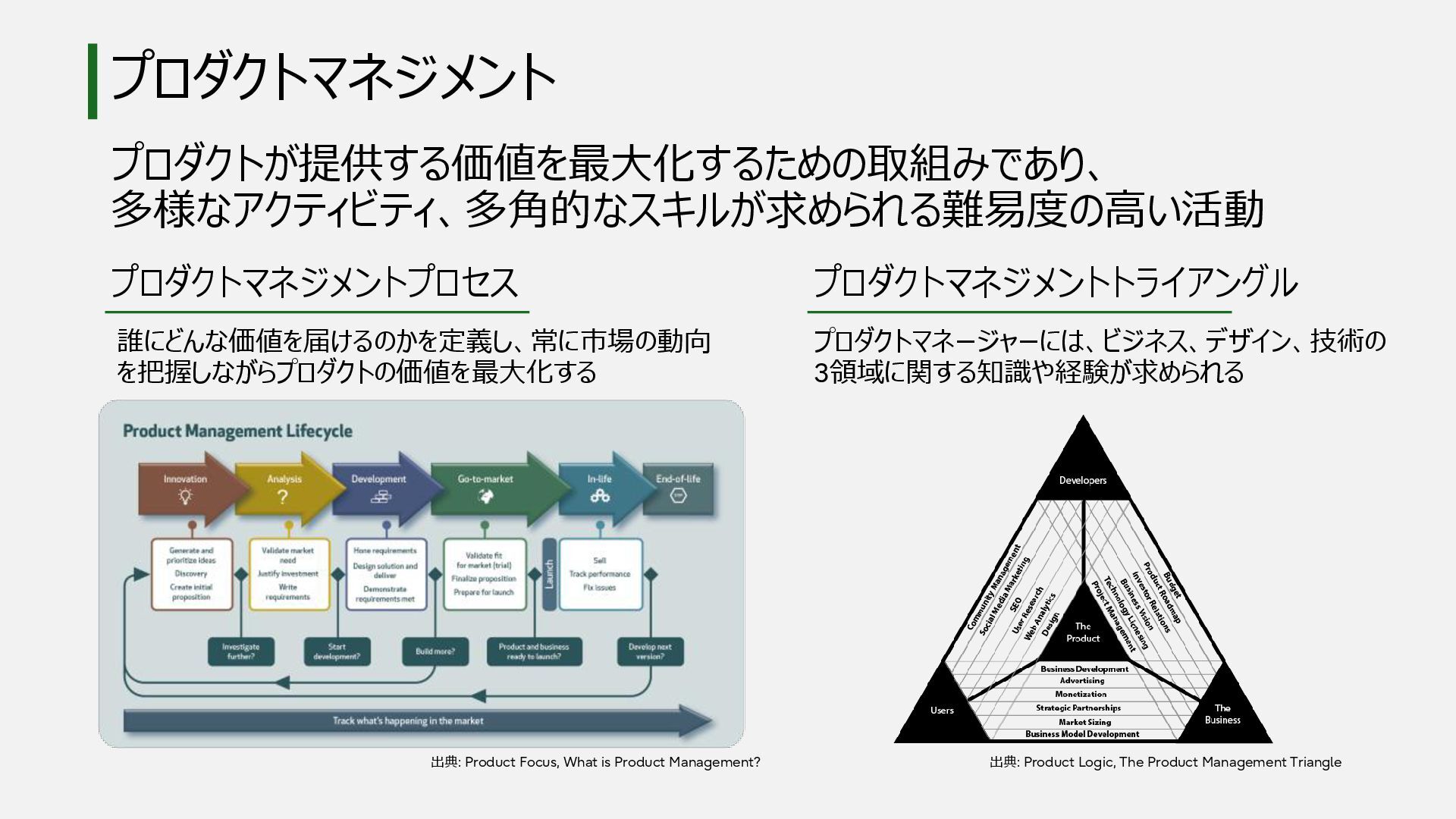 出典: Product Logic, The Product Management Triangle プロダクトマネジメントプロセス プロダクトマネジメントトライアングル 誰にどんな価値を届けるのかを定義し、常に市場の動向 を把握しながらプロダクトの価値を最大化する プロダクトマネージャーには、ビジネス、デザイン、技術の 3領域に関する知識や経験が求められる