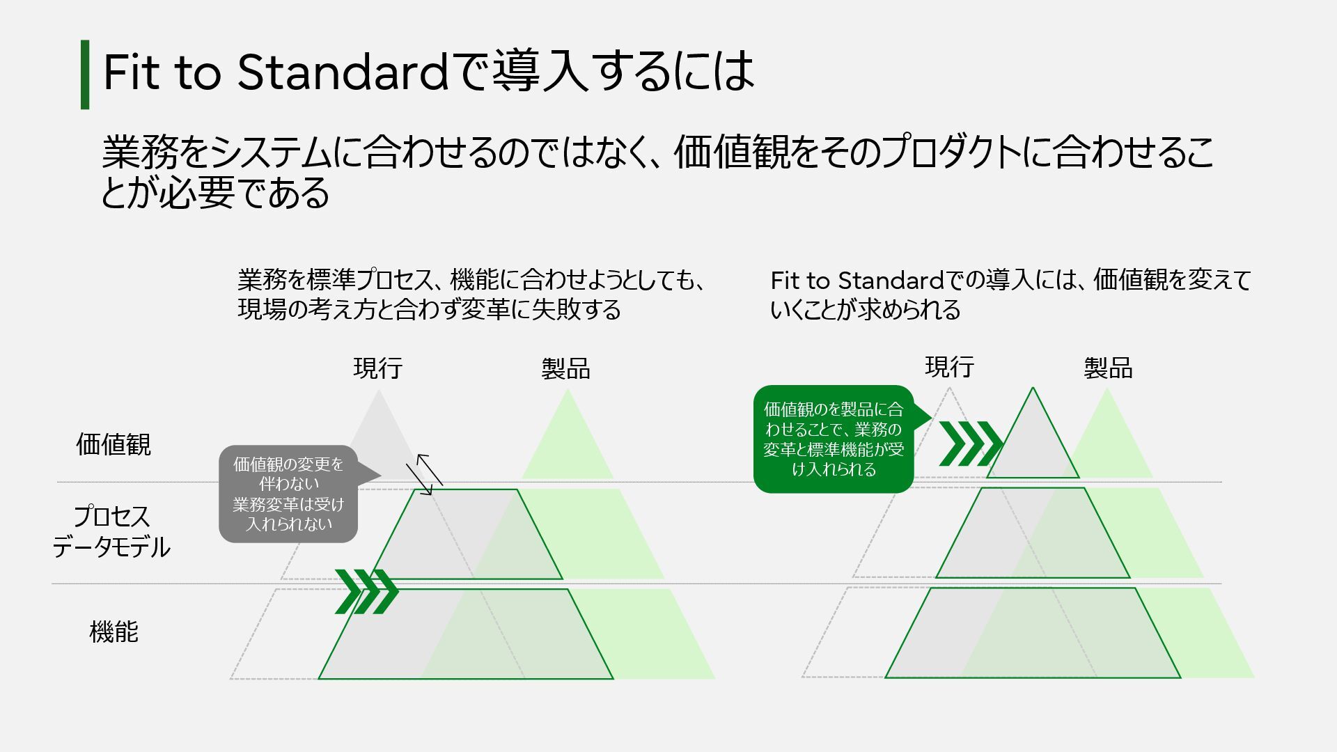 Fit to Standardで導入するには 業務をシステムに合わせるのではなく、価値観をそのプロダクトに合わせるこ とが必要である 価値観 プロセス データモデル 機能 業務を標準プロセス、機能に合わせようとしても、