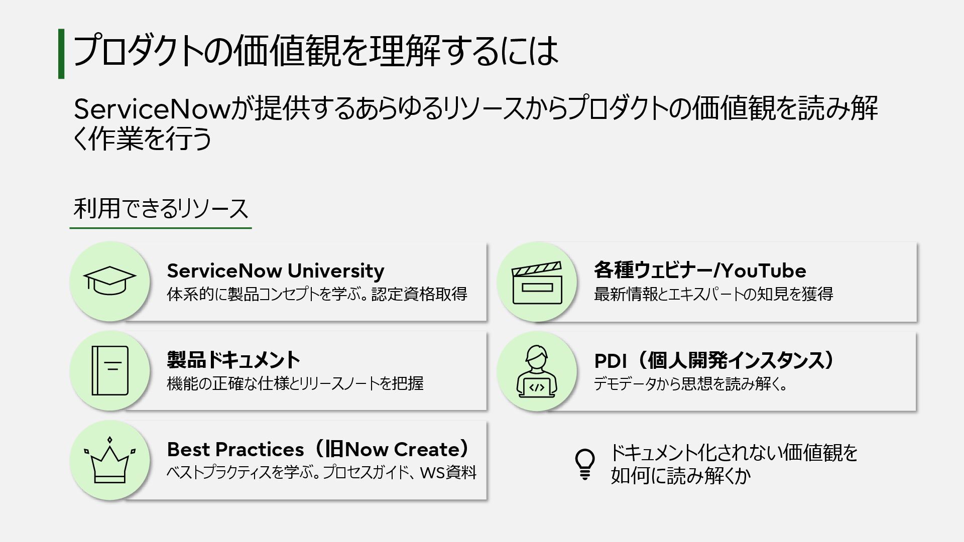 プロダクトの価値観を理解するには ServiceNowが提供するあらゆるリソースからプロダクトの価値観を読み解 く作業を行う 利用できるリソース 各種ウェビナー/YouTube 最新情報とエキスパートの知見を獲得 PDI(個人開発インスタンス) デモデータから思想を読み解く。 製品ドキュメント 機能の正確な仕様とリリースノートを把握