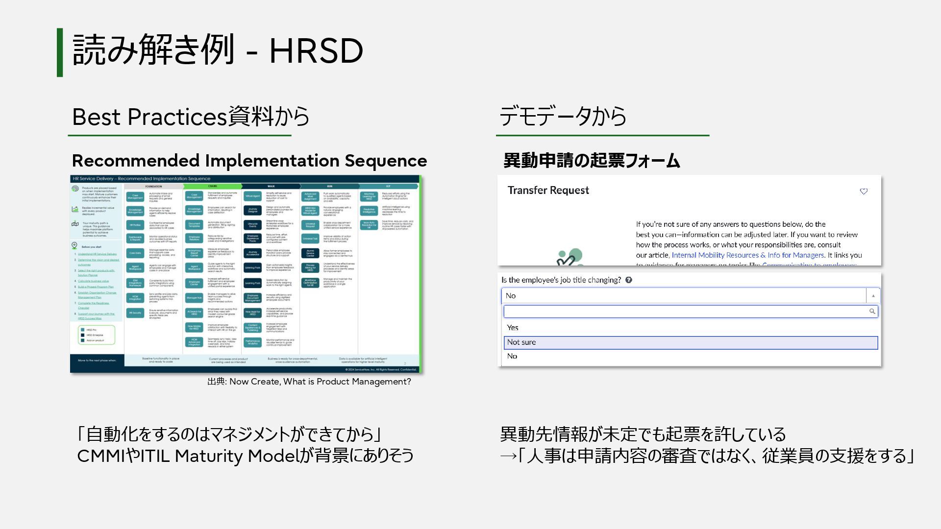 読み解き例 - HRSD Best Practices資料から Recommended Implementation Sequence デモデータから 「自動化をするのはマネジメントができてから」