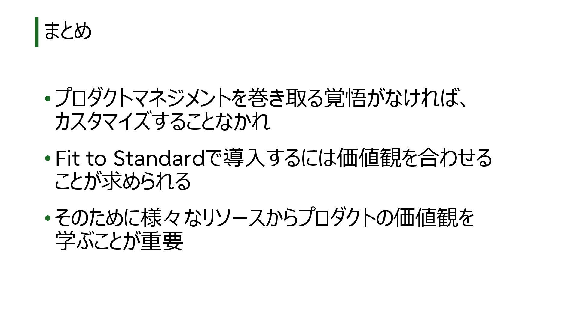まとめ •プロダクトマネジメントを巻き取る覚悟がなければ、 カスタマイズすることなかれ •Fit to Standardで導入するには価値観を合わせる ことが求められる •そのために様々なリソースからプロダクトの価値観を 学ぶことが重要