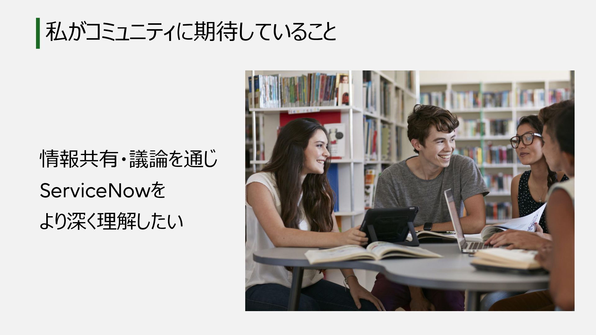 私がコミュニティに期待していること 情報共有・議論を通じ ServiceNowを より深く理解したい