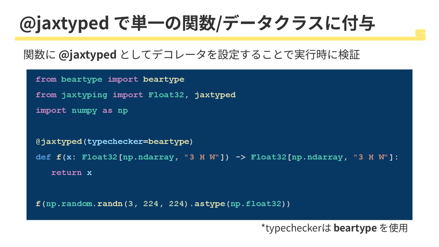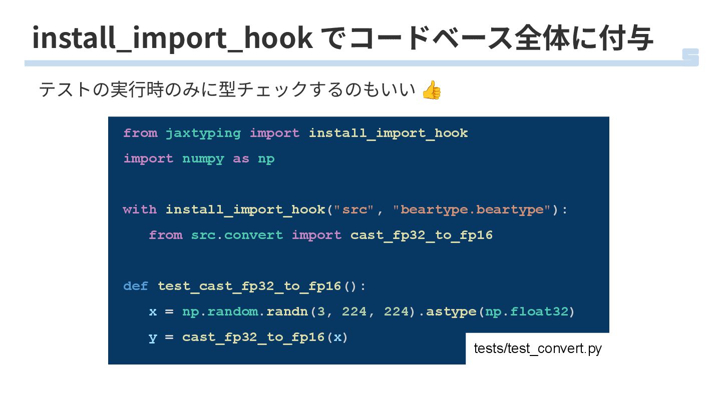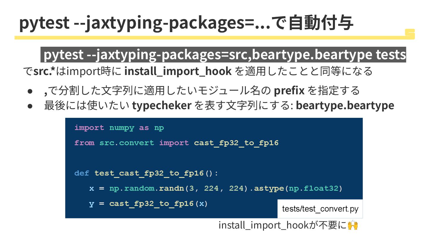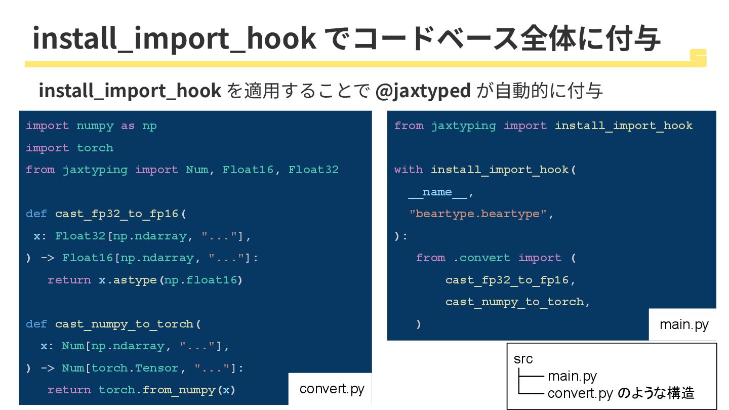 Float16, Float32 def cast_fp32_to_fp16( x: Float32[np.ndarray, "..."], ) -> Float16[np.ndarray, "..."]: return x.astype(np.float16) def cast_numpy_to_torch( x: Num[np.ndarray, "..."], ) -> Num[torch.Tensor, "..."]: return torch.from_numpy(x) from jaxtyping import install_import_hook with install_import_hook( __name__, "beartype.beartype", ): from .convert import ( cast_fp32_to_fp16, cast_numpy_to_torch, ) install_import_hook でコードベース全体に付与 src ├── main.py └── convert.py のような構造 install_import_hook を適⽤することで @jaxtyped が⾃動的に付与 convert.py main.py
