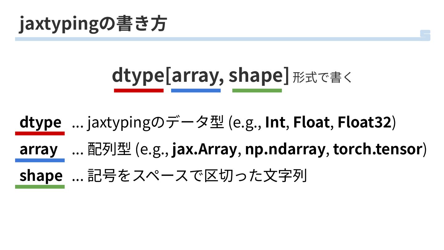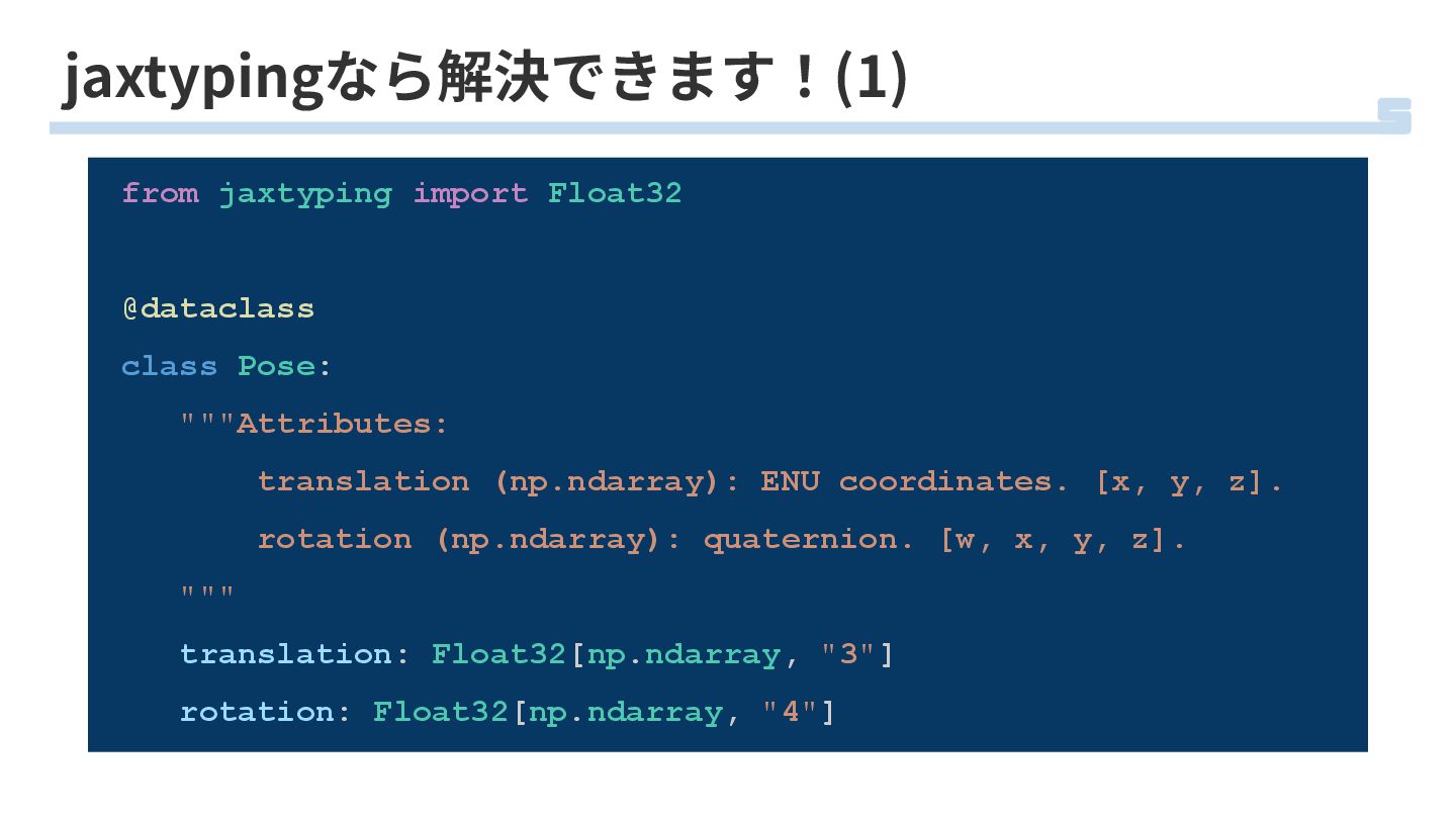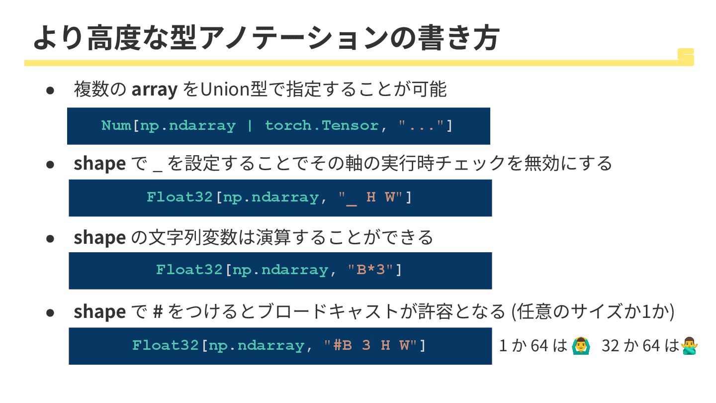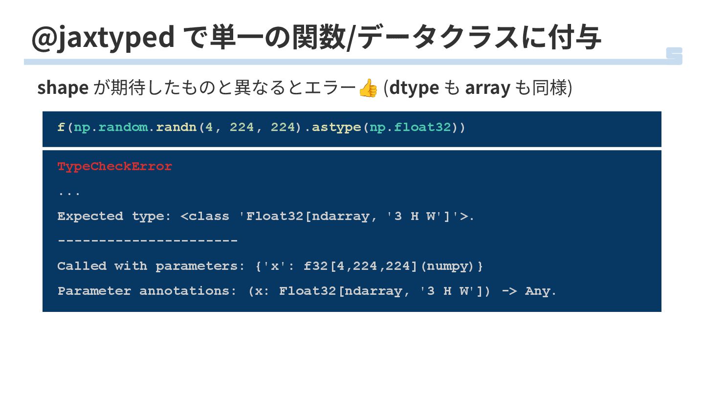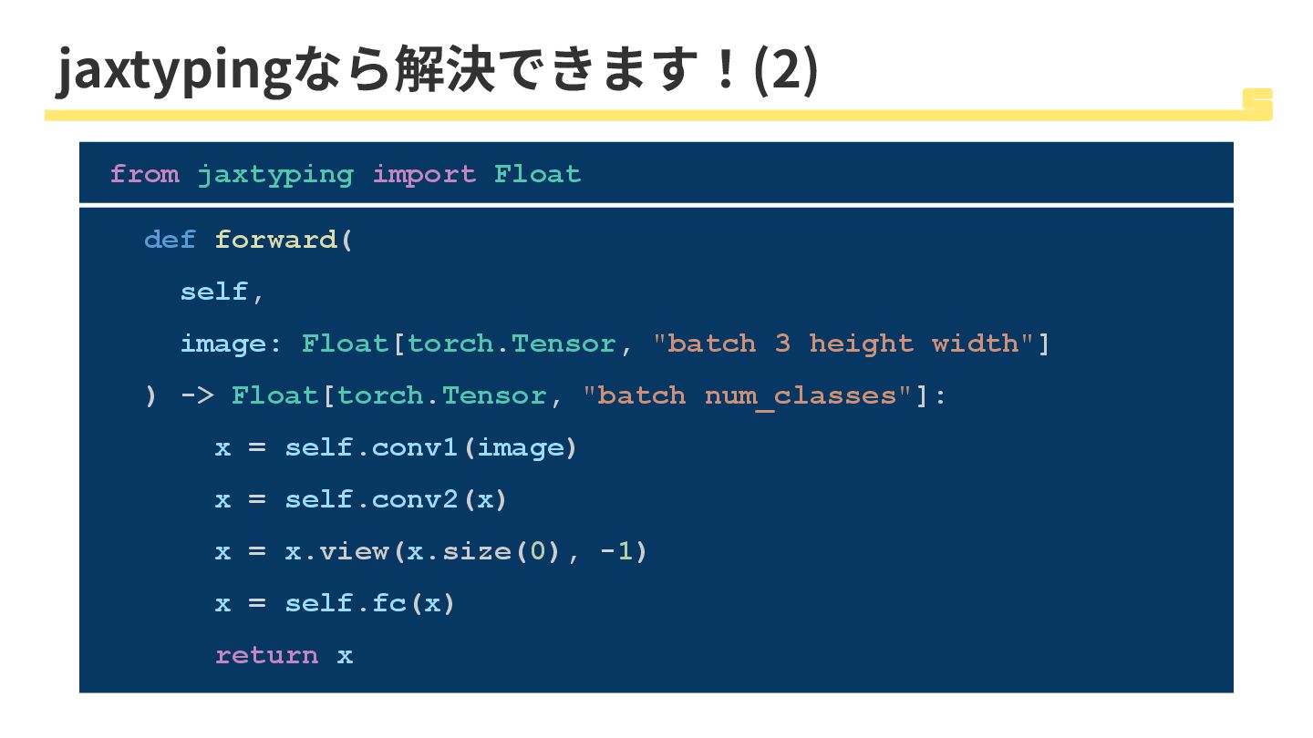 Float16, Float32 def cast_fp32_to_fp16( x: Float32[np.ndarray, "..."], ) -> Float16[np.ndarray, "..."]: return x.astype(np.float16) def cast_numpy_to_torch( x: Num[np.ndarray, "..."], ) -> Num[torch.Tensor, "..."]: return torch.from_numpy(x) from jaxtyping import install_import_hook with install_import_hook( __name__, "beartype.beartype", ): from .convert import ( cast_fp32_to_fp16, cast_numpy_to_torch, ) install_import_hook でコードベース全体に付与 src ├── main.py └── convert.py のような構造 install_import_hook を適⽤することで @jaxtyped が⾃動的に付与 convert.py main.py