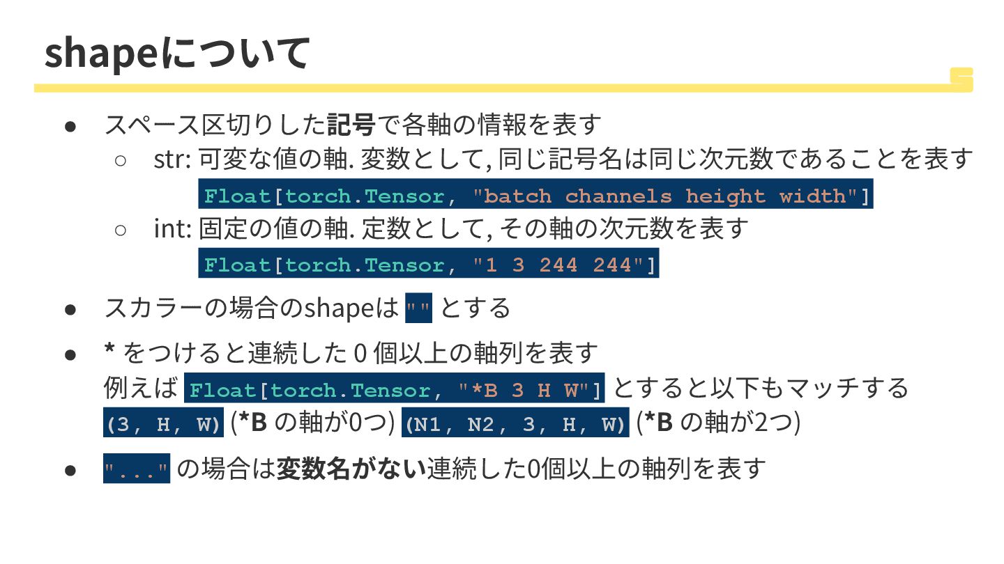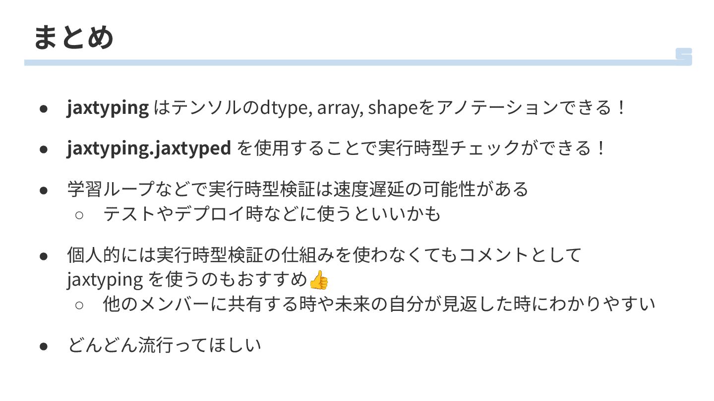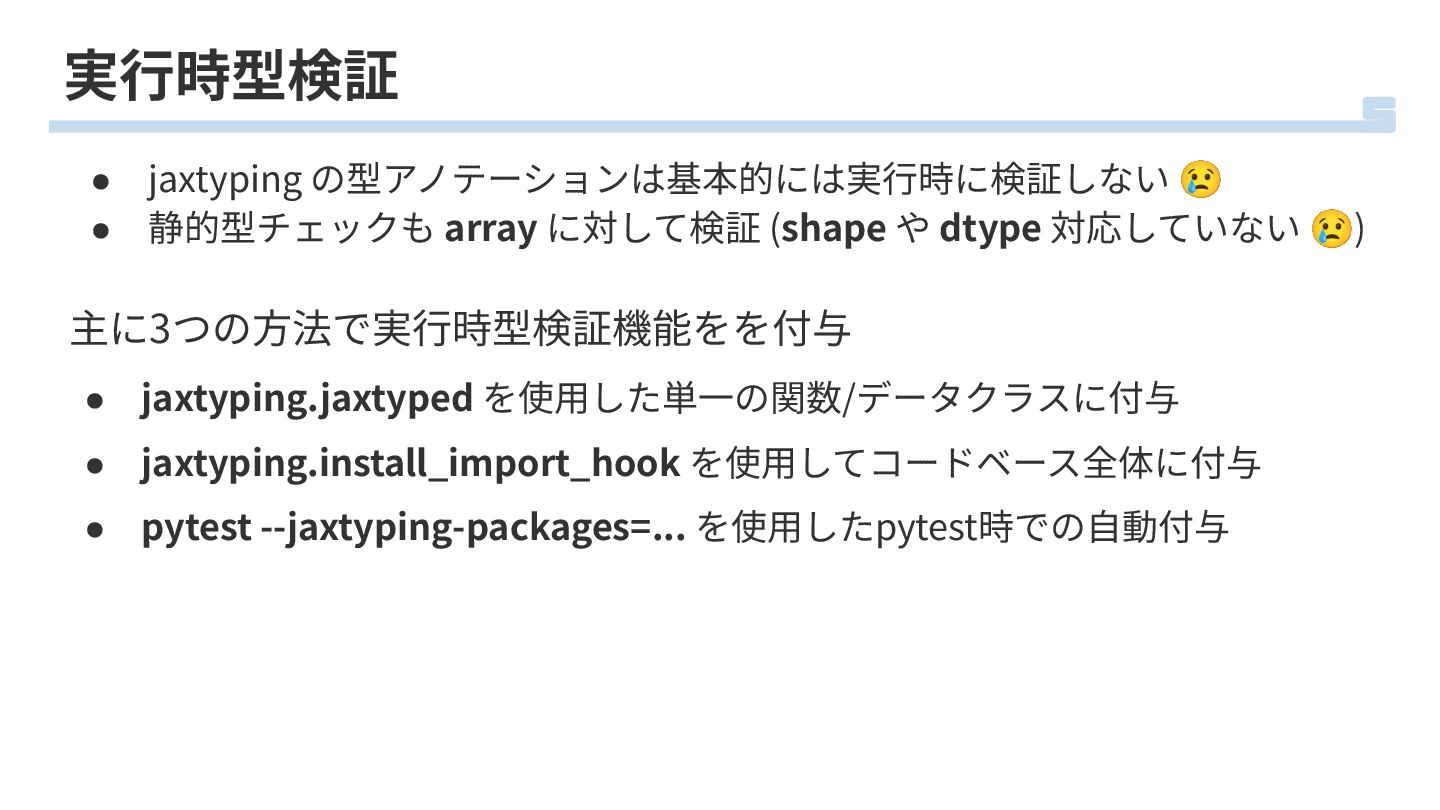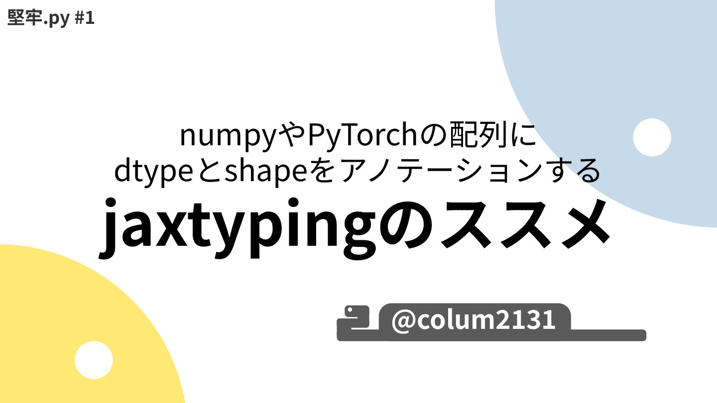 Float16, Float32 def cast_fp32_to_fp16( x: Float32[np.ndarray, "..."], ) -> Float16[np.ndarray, "..."]: return x.astype(np.float16) def cast_numpy_to_torch( x: Num[np.ndarray, "..."], ) -> Num[torch.Tensor, "..."]: return torch.from_numpy(x) from jaxtyping import install_import_hook with install_import_hook( __name__, "beartype.beartype", ): from .convert import ( cast_fp32_to_fp16, cast_numpy_to_torch, ) install_import_hook でコードベース全体に付与 src ├── main.py └── convert.py のような構造 install_import_hook を適⽤することで @jaxtyped が⾃動的に付与 convert.py main.py