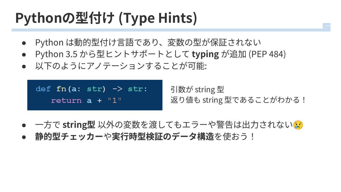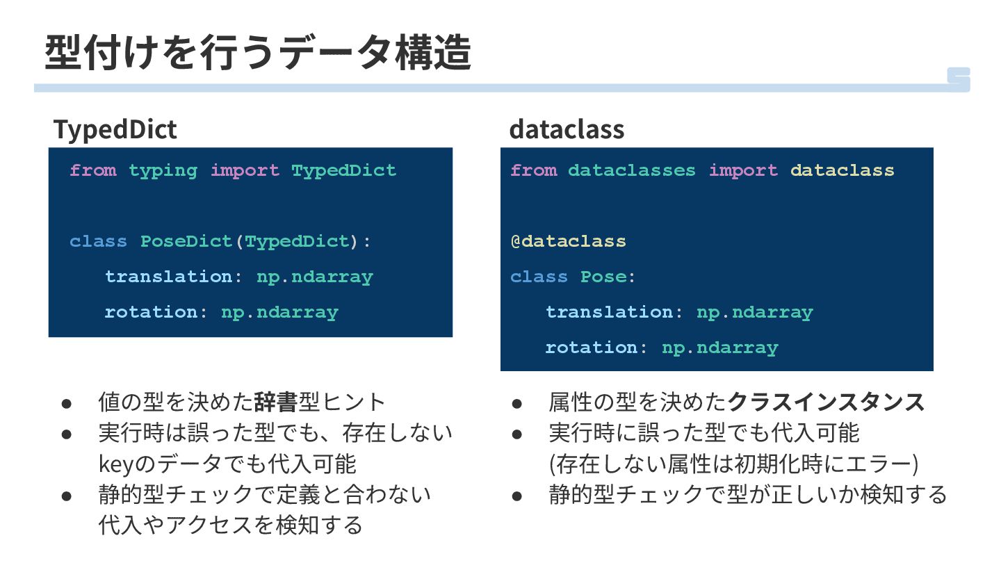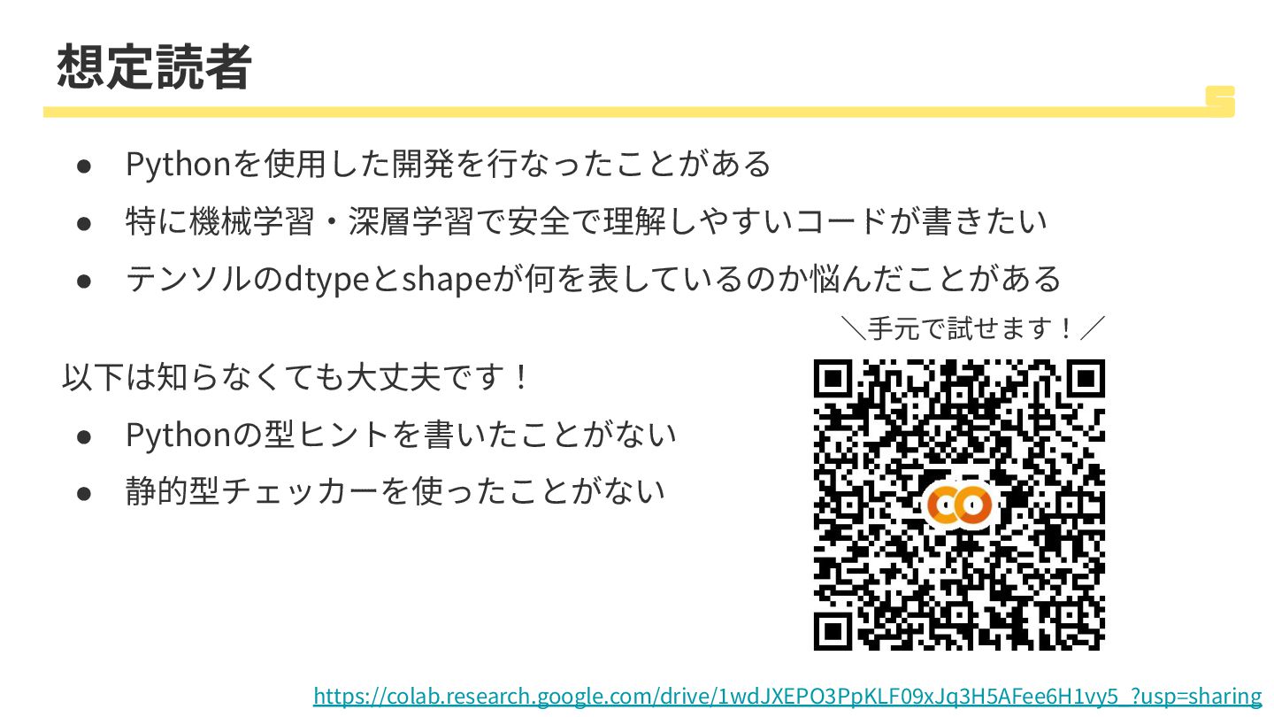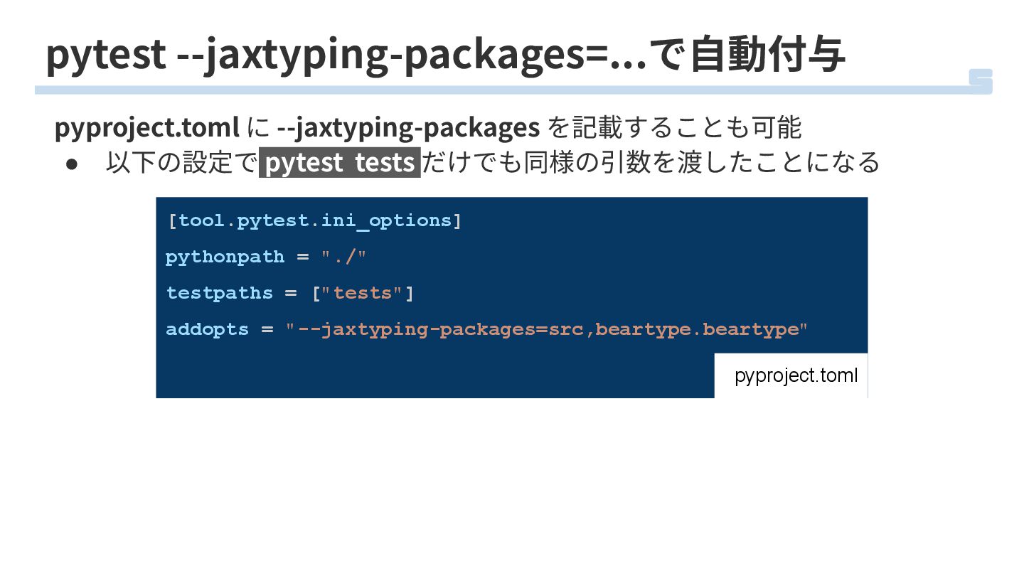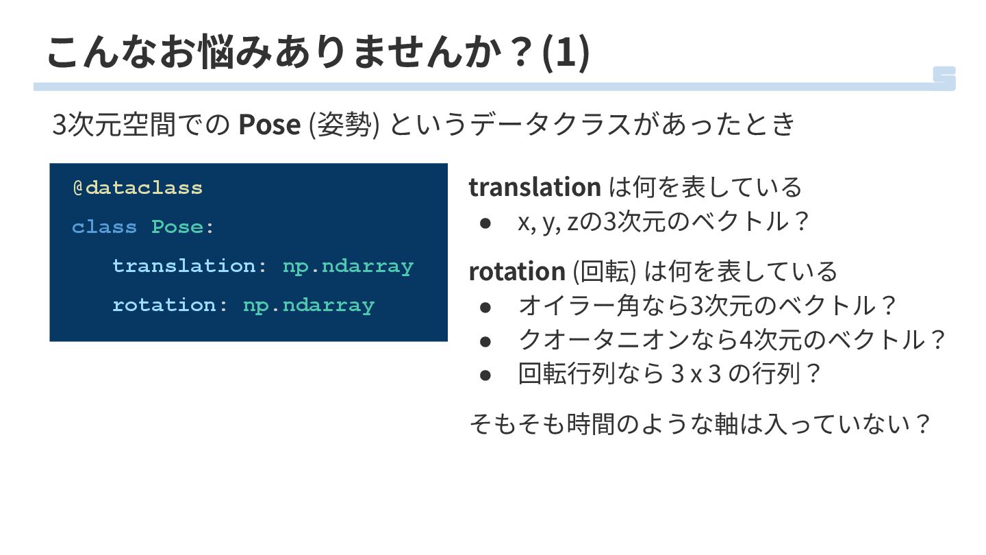 Float16, Float32 def cast_fp32_to_fp16( x: Float32[np.ndarray, "..."], ) -> Float16[np.ndarray, "..."]: return x.astype(np.float16) def cast_numpy_to_torch( x: Num[np.ndarray, "..."], ) -> Num[torch.Tensor, "..."]: return torch.from_numpy(x) from jaxtyping import install_import_hook with install_import_hook( __name__, "beartype.beartype", ): from .convert import ( cast_fp32_to_fp16, cast_numpy_to_torch, ) install_import_hook でコードベース全体に付与 src ├── main.py └── convert.py のような構造 install_import_hook を適⽤することで @jaxtyped が⾃動的に付与 convert.py main.py