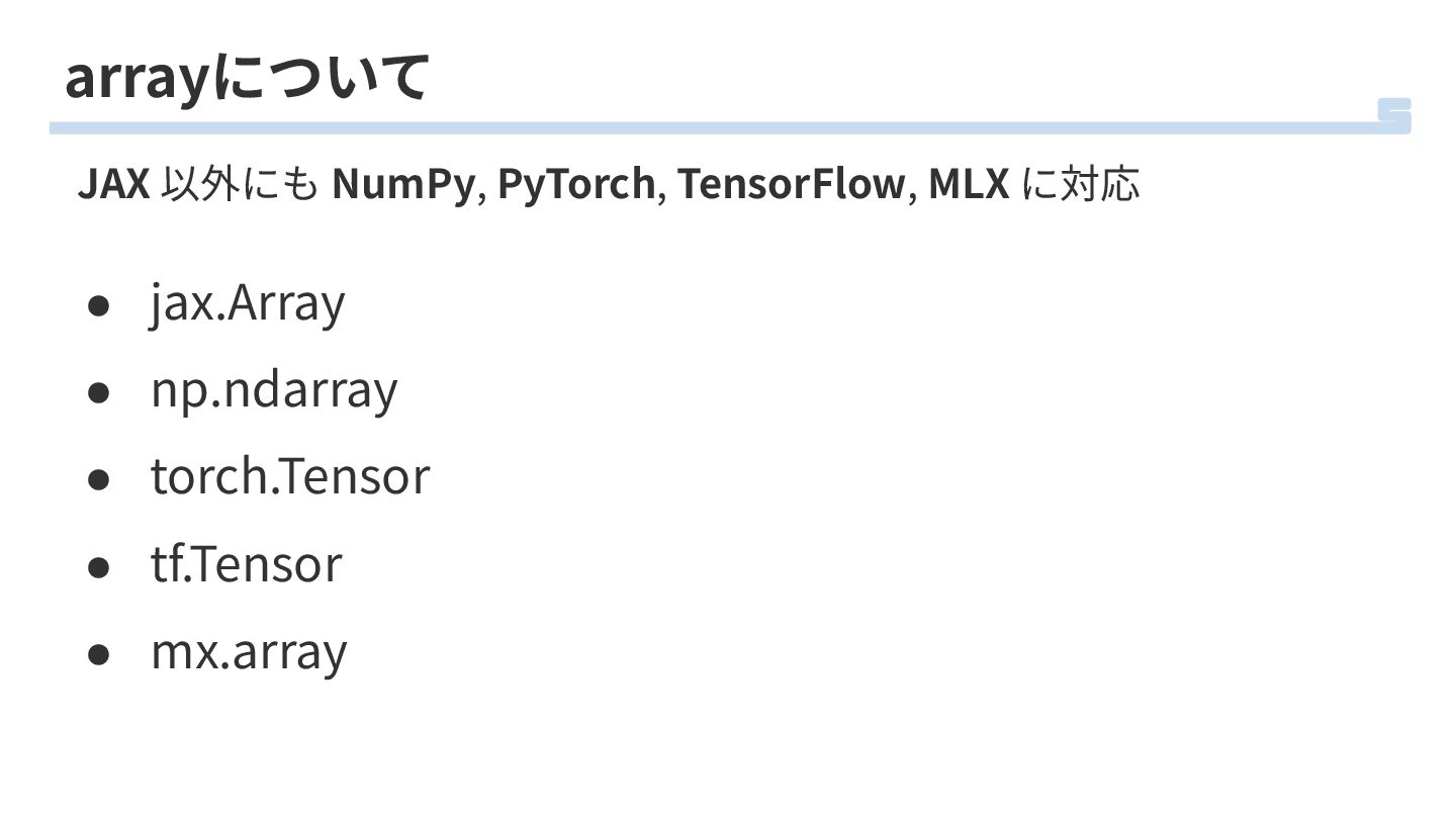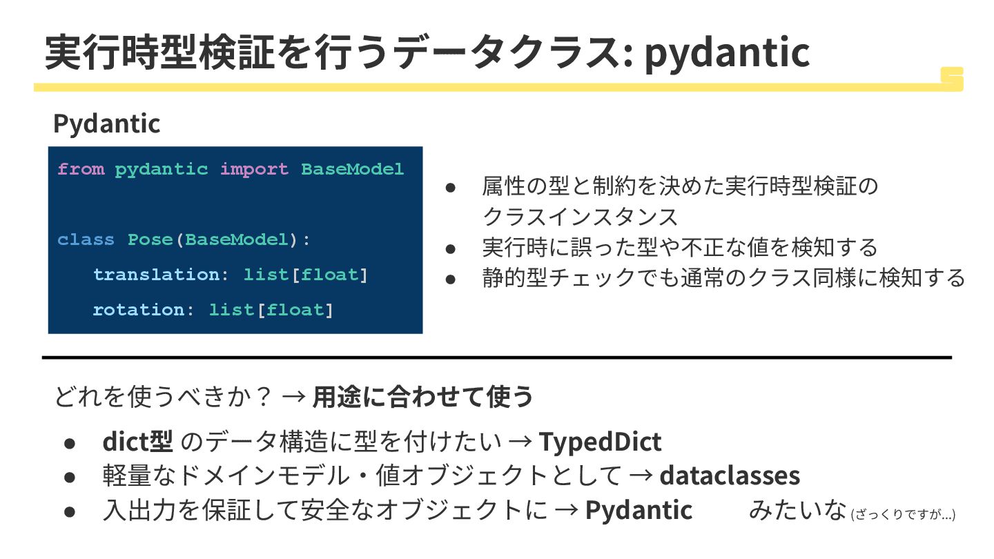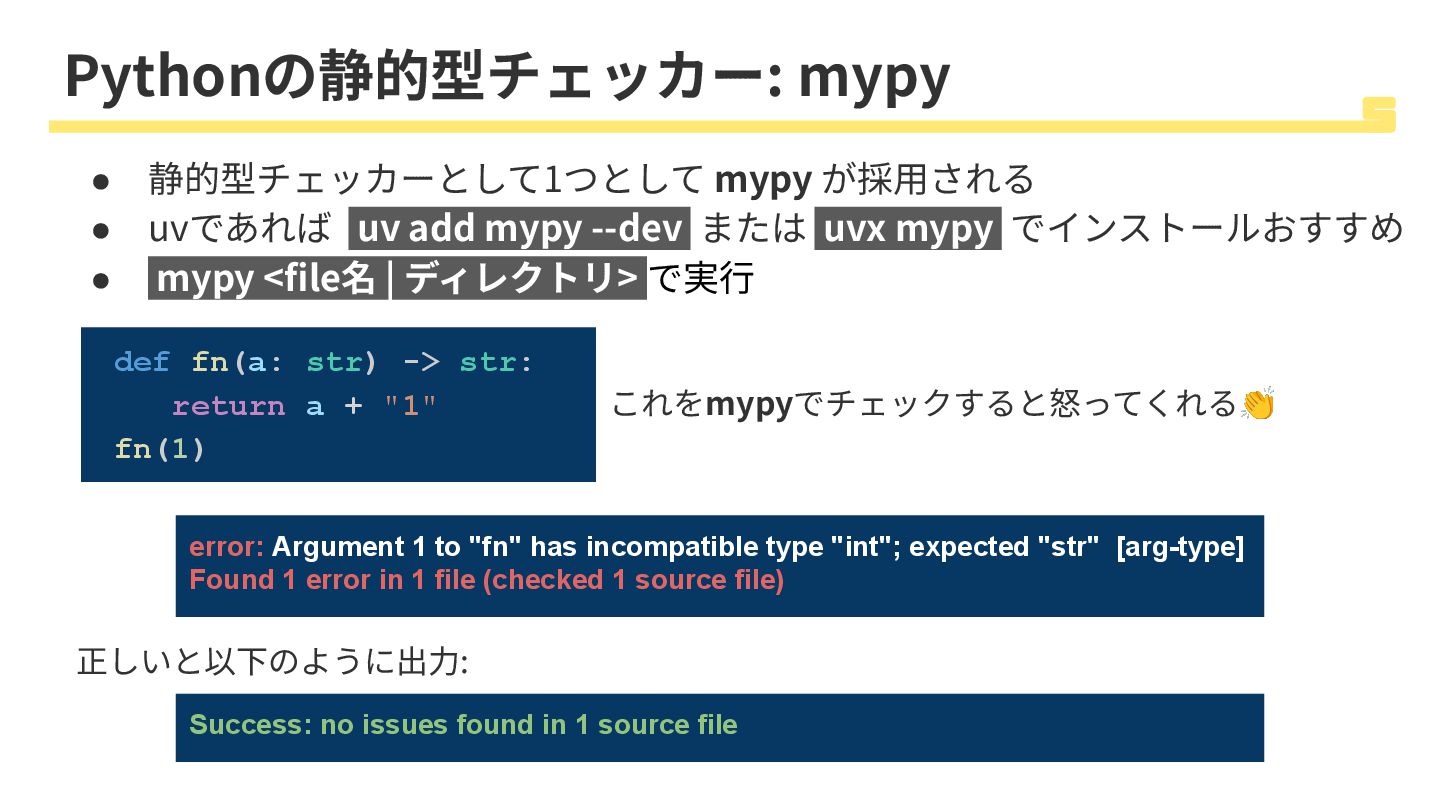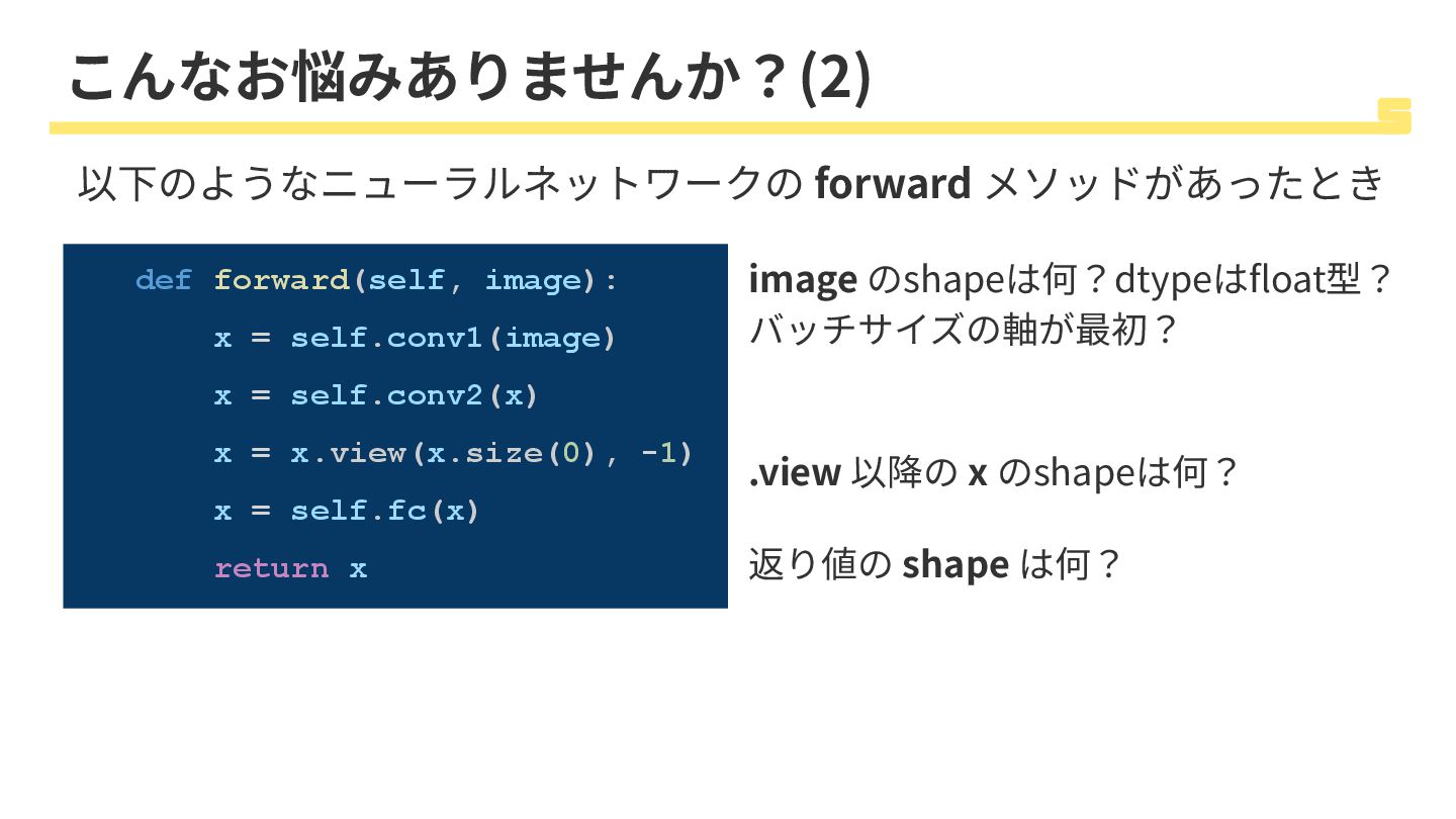 Float16, Float32 def cast_fp32_to_fp16( x: Float32[np.ndarray, "..."], ) -> Float16[np.ndarray, "..."]: return x.astype(np.float16) def cast_numpy_to_torch( x: Num[np.ndarray, "..."], ) -> Num[torch.Tensor, "..."]: return torch.from_numpy(x) from jaxtyping import install_import_hook with install_import_hook( __name__, "beartype.beartype", ): from .convert import ( cast_fp32_to_fp16, cast_numpy_to_torch, ) install_import_hook でコードベース全体に付与 src ├── main.py └── convert.py のような構造 install_import_hook を適⽤することで @jaxtyped が⾃動的に付与 convert.py main.py