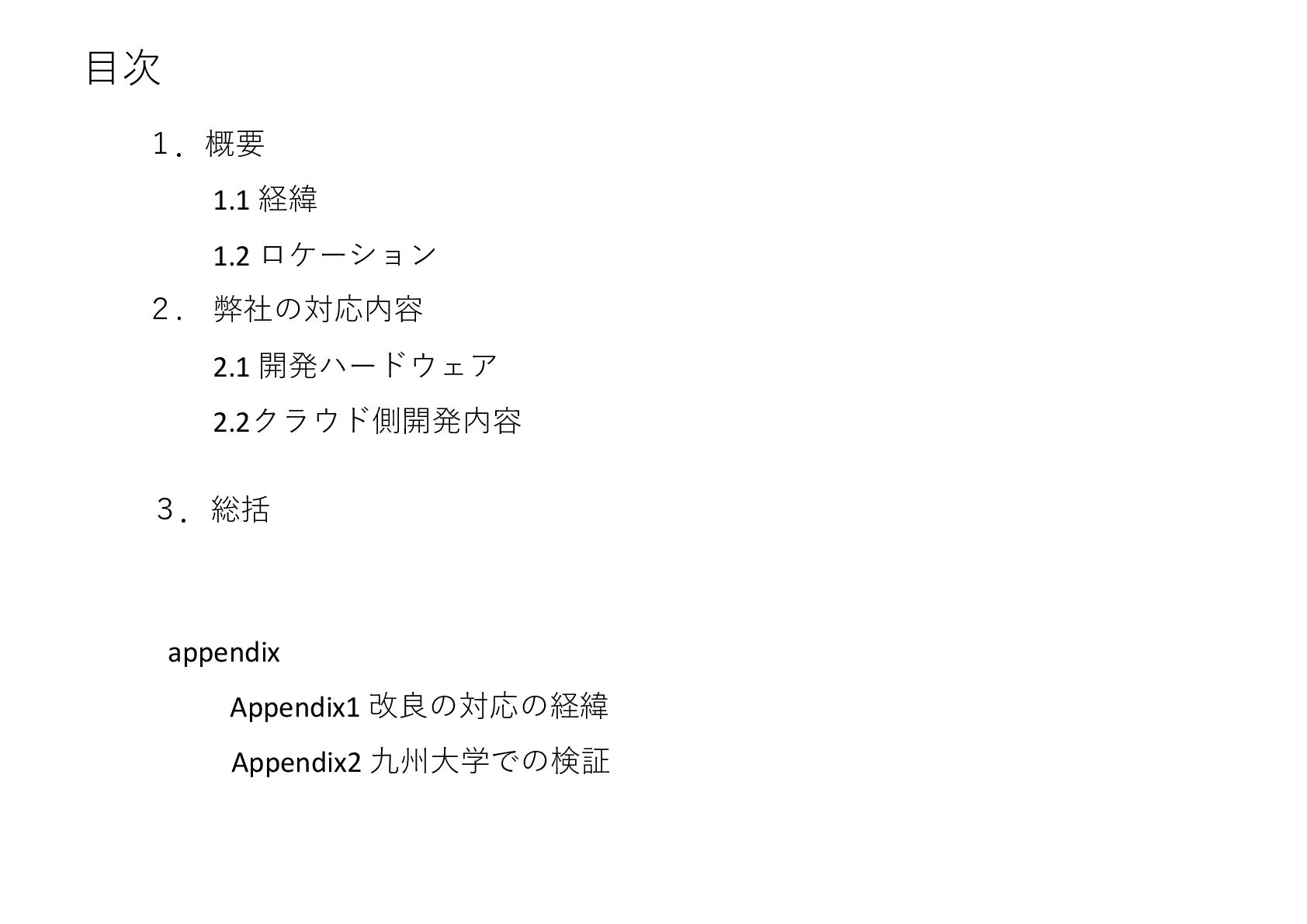 開発ハードウェア 2.2クラウド側開発内容 Appendix1 改良の対応の経緯 Appendix2 九州⼤学での検証 appendix