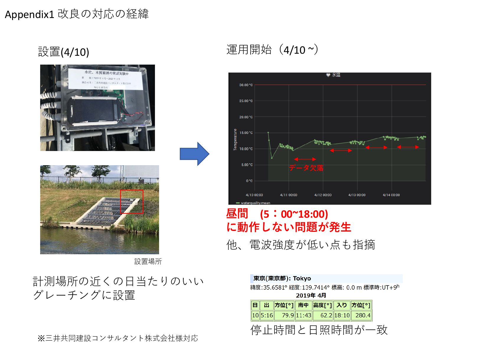 計測場所の近くの⽇当たりのいい グレーチングに設置 設置場所 Appendix1 改良の対応の経緯 設置(4/10) ※三井共同建設コンサルタント株式会社様対応 運⽤開始(4/10 ~) データ⽋落