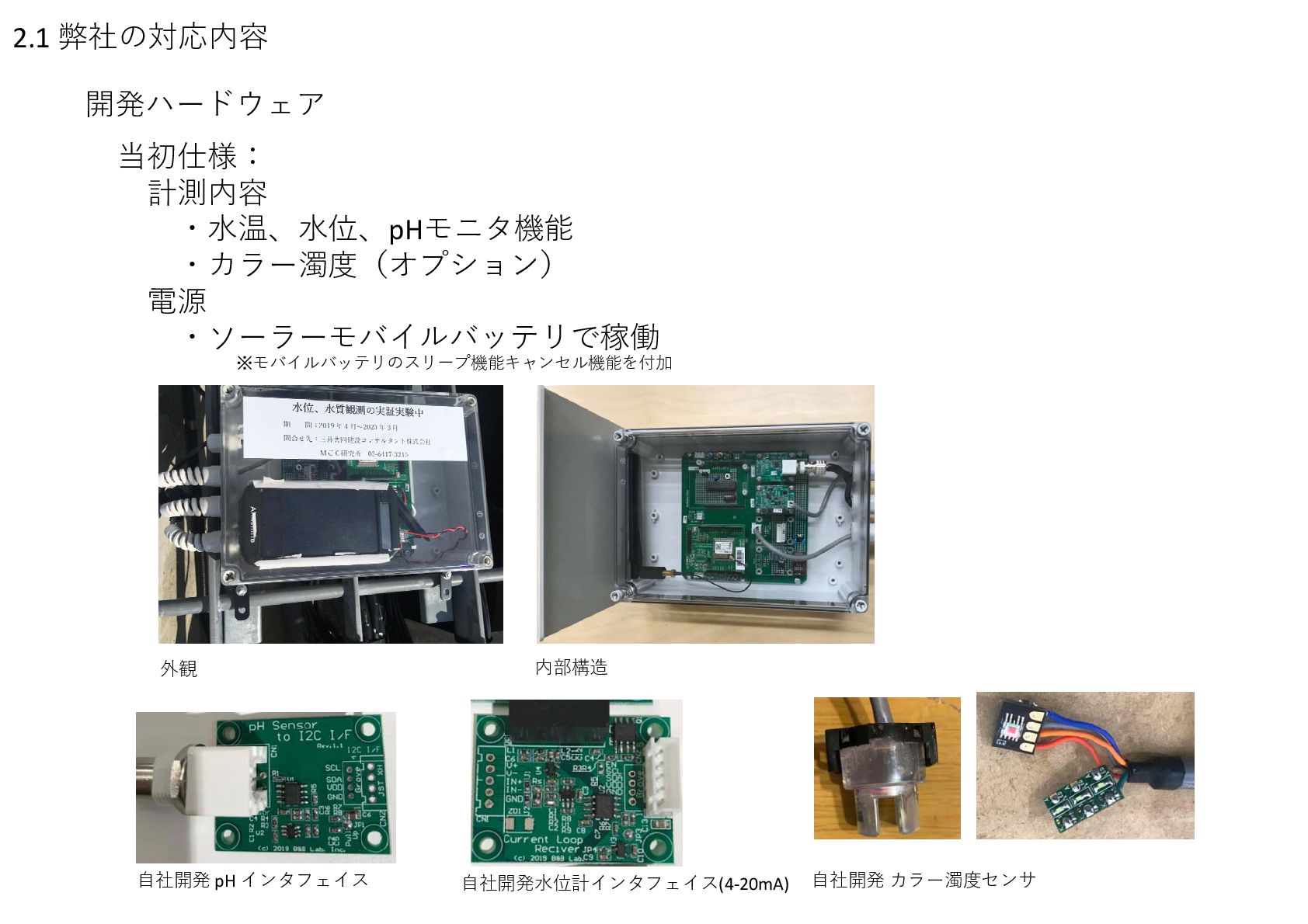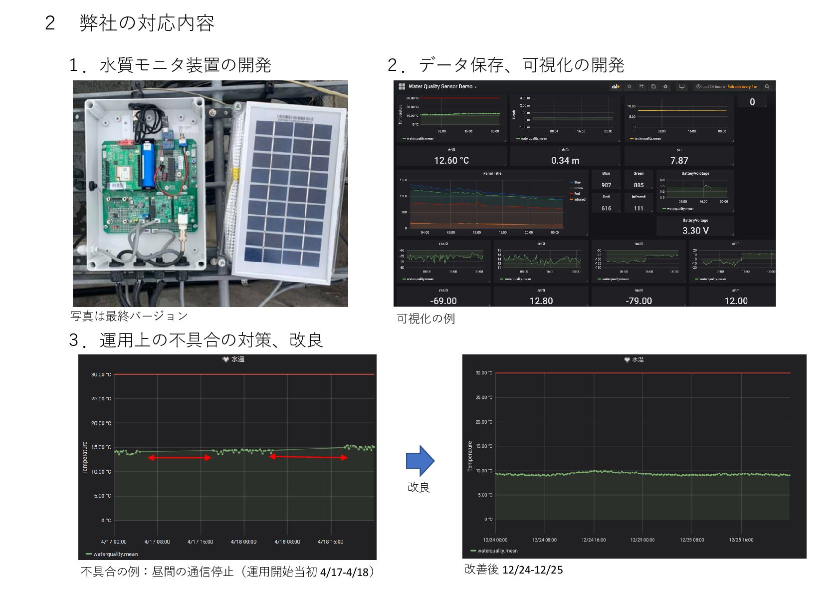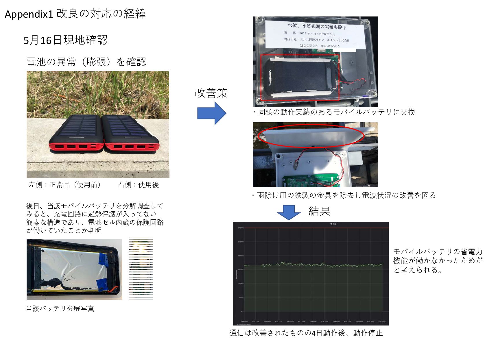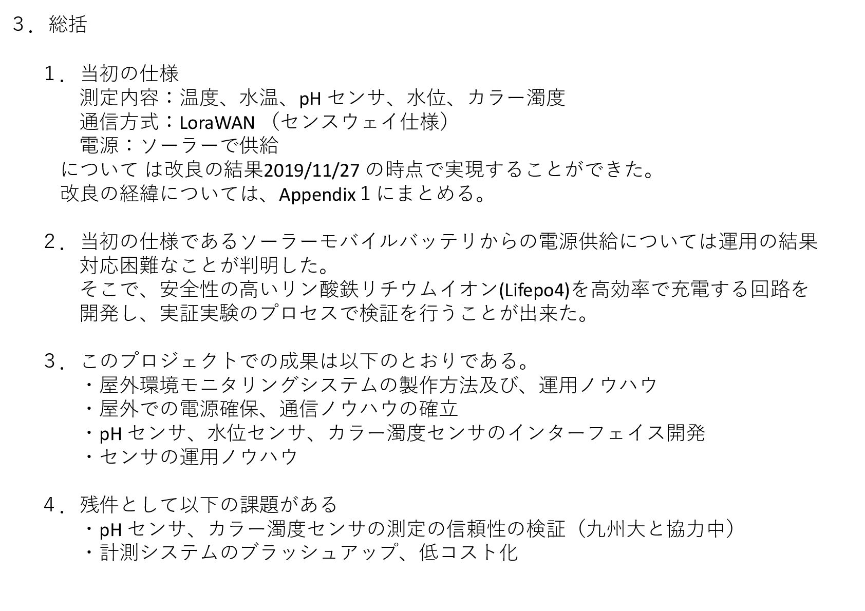 改良の経緯については、Appendix1にまとめる。 2.当初の仕様であるソーラーモバイルバッテリからの電源供給については運⽤の結果 対応困難なことが判明した。 そこで、安全性の⾼いリン酸鉄リチウムイオン(Lifepo4)を⾼効率で充電する回路を 開発し、実証実験のプロセスで検証を⾏うことが出来た。 3.このプロジェクトでの成果は以下のとおりである。 ・屋外環境モニタリングシステムの製作⽅法及び、運⽤ノウハウ ・屋外での電源確保、通信ノウハウの確⽴ ・pH センサ、⽔位センサ、カラー濁度センサのインターフェイス開発 ・センサの運⽤ノウハウ 4.残件として以下の課題がある ・pH センサ、カラー濁度センサの測定の信頼性の検証(九州⼤と協⼒中) ・計測システムのブラッシュアップ、低コスト化