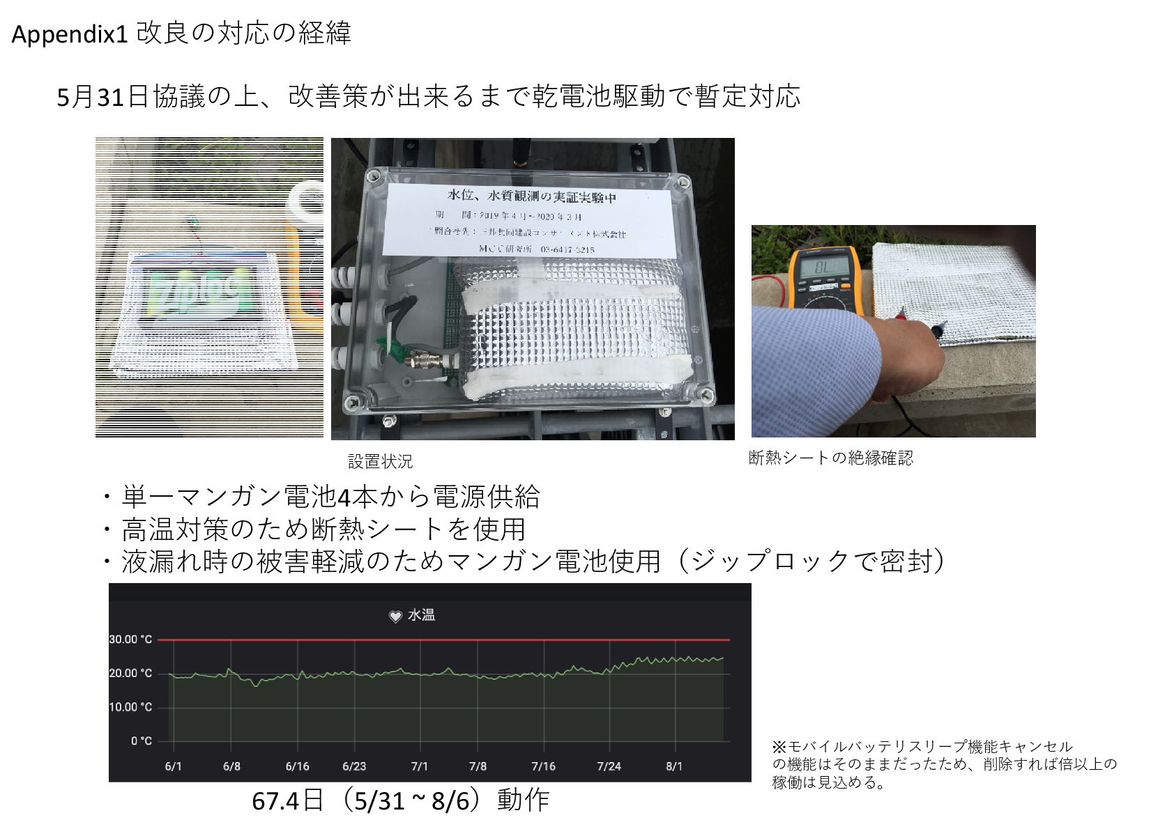 Appendix1 改良の対応の経緯 5⽉31⽇協議の上、改善策が出来るまで乾電池駆動で暫定対応 ・単⼀マンガン電池4本から電源供給 ・⾼温対策のため断熱シートを使⽤ ・液漏れ時の被害軽減のためマンガン電池使⽤(ジップロックで密封) 断熱シートの絶縁確認 設置状況 ※モバイルバッテリスリープ機能キャンセル の機能はそのままだったため、削除すれば倍以上の