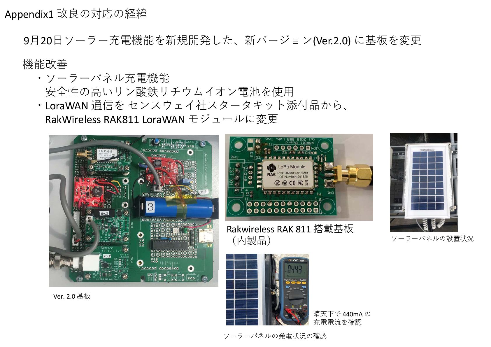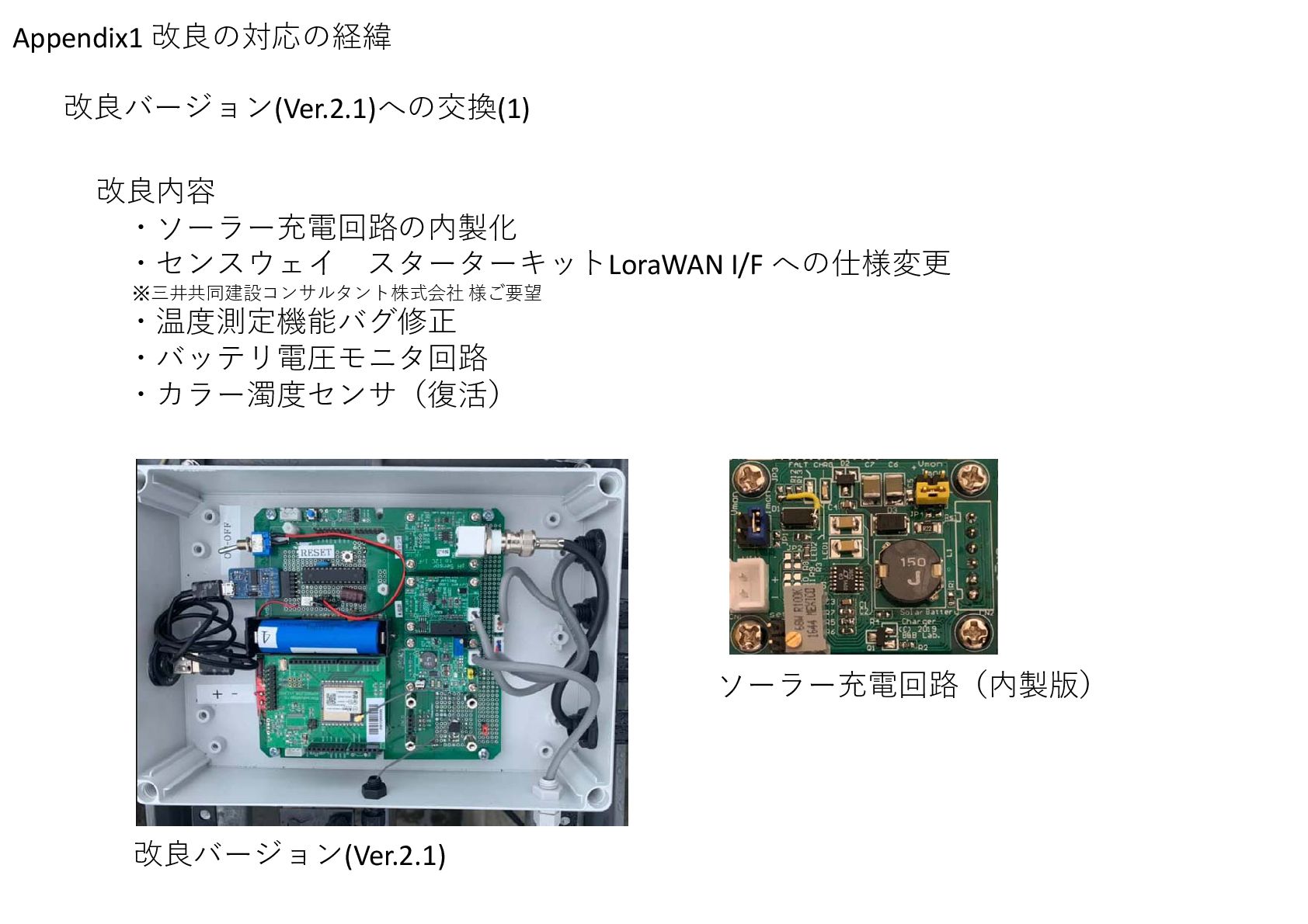 Appendix1 改良の対応の経緯 改良バージョン(Ver.2.1)への交換(1) 改良内容 ・ソーラー充電回路の内製化 ・センスウェイ スターターキットLoraWAN I/F への仕様変更 ※三井共同建設コンサルタント株式会社