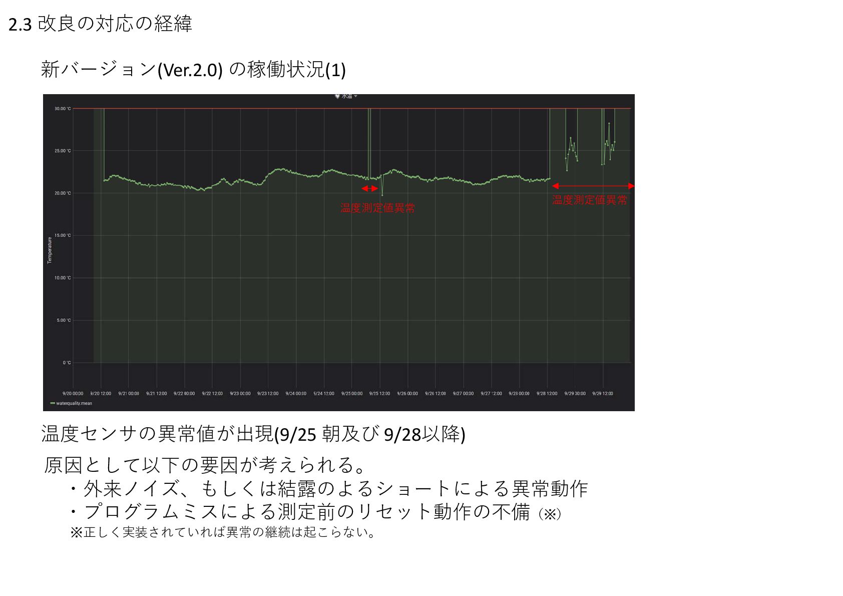 2.3 改良の対応の経緯 新バージョン(Ver.2.0) の稼働状況(1) 温度センサの異常値が出現(9/25 朝及び 9/28以降) 温度測定値異常 温度測定値異常 原因として以下の要因が考えられる。