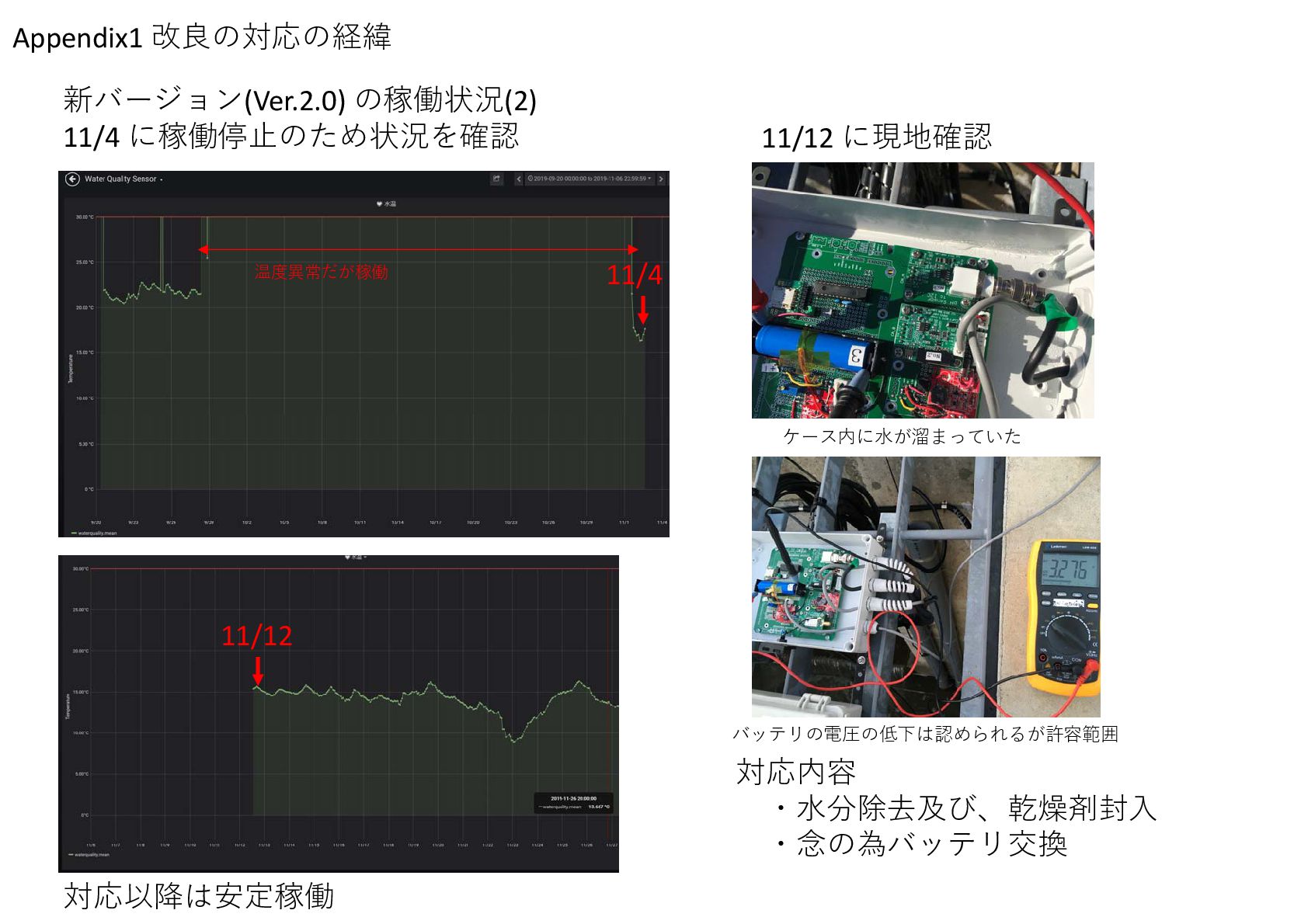 新バージョン(Ver.2.0) の稼働状況(2) 11/4 に稼働停⽌のため状況を確認 Appendix1 改良の対応の経緯 ケース内に⽔が溜まっていた バッテリの電圧の低下は認められるが許容範囲 対応内容 ・⽔分除去及び、乾燥剤封⼊