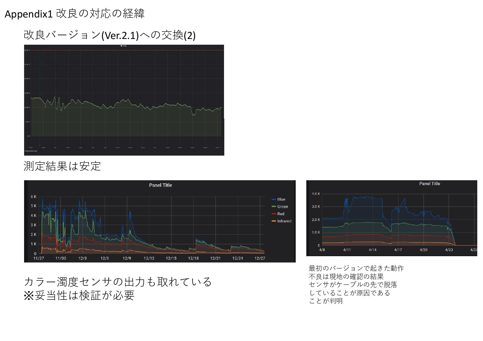 Appendix1 改良の対応の経緯 改良バージョン(Ver.2.1)への交換(2) 測定結果は安定 カラー濁度センサの出⼒も取れている ※妥当性は検証が必要 最初のバージョンで起きた動作 不良は現地の確認の結果 センサがケーブルの先で脱落 していることが原因である