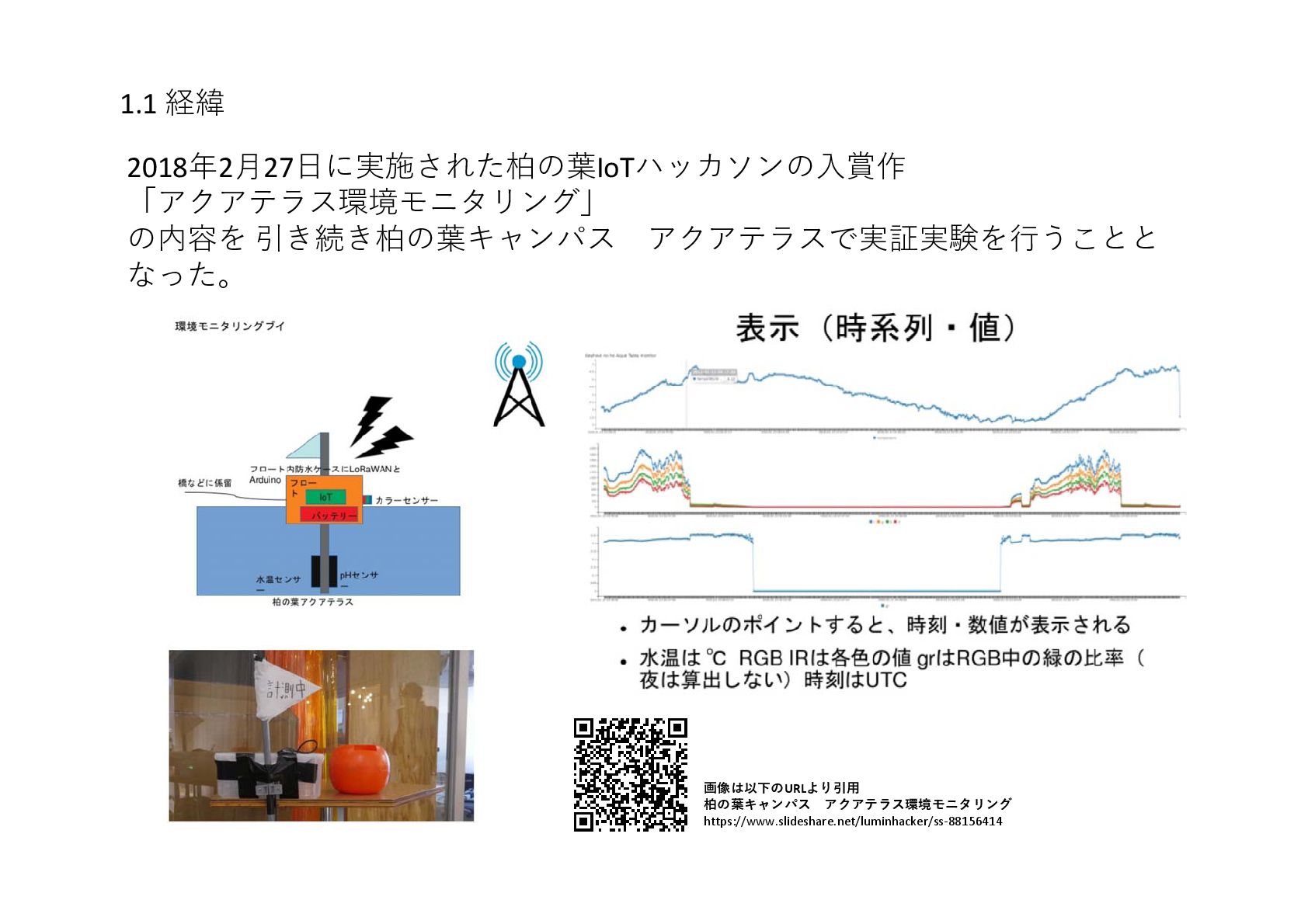 1.1 経緯 画像は以下のURLより引⽤ 柏の葉キャンパス アクアテラス環境モニタリング https://www.slideshare.net/luminhacker/ss‐88156414 2018年2⽉27⽇に実施された柏の葉IoTハッカソンの⼊賞作 「アクアテラス環境モニタリング」 の内容を 引き続き柏の葉キャンパス