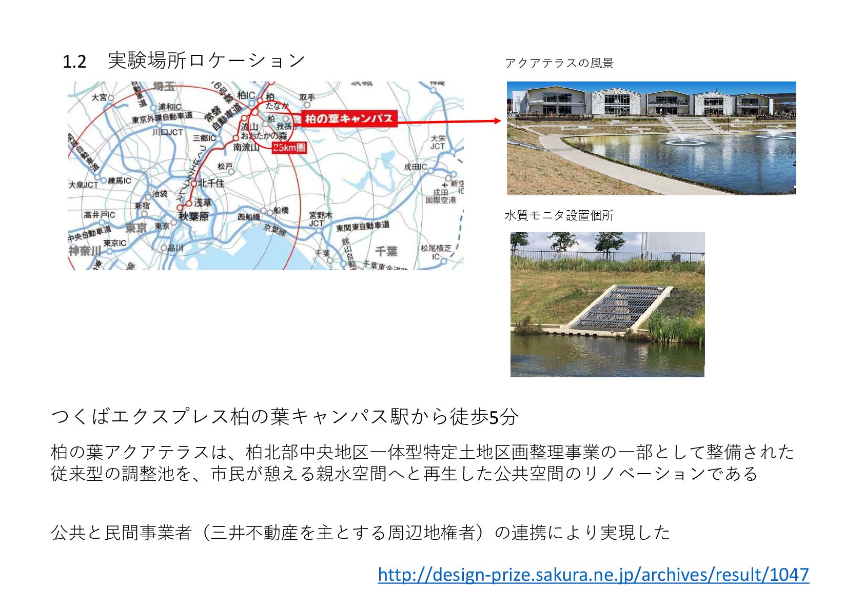 つくばエクスプレス柏の葉キャンパス駅から徒歩5分 柏の葉アクアテラスは、柏北部中央地区⼀体型特定⼟地区画整理事業の⼀部として整備された 従来型の調整池を、市⺠が憩える親⽔空間へと再⽣した公共空間のリノベーションである 公共と⺠間事業者(三井不動産を主とする周辺地権者)の連携により実現した http://design‐prize.sakura.ne.jp/archives/result/1047 アクアテラスの⾵景 ⽔質モニタ設置個所 1.2 実験場所ロケーション