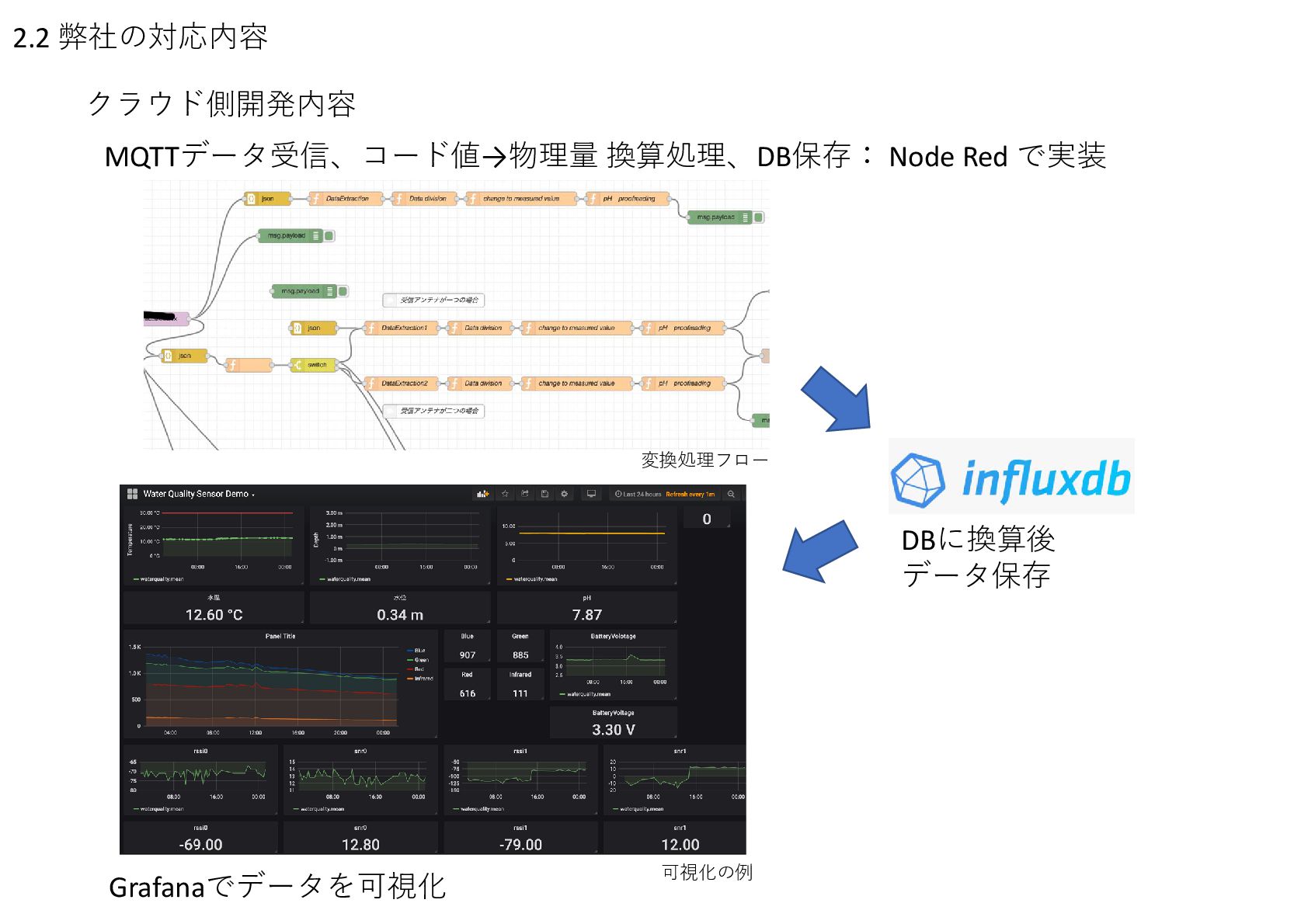 3.総括 1.当初の仕様 測定内容:温度、⽔温、pH センサ、⽔位、カラー濁度 通信⽅式:LoraWAN (センスウェイ仕様) 電源:ソーラーで供給 について は改良の結果2019/11/27 の時点で実現することができた。