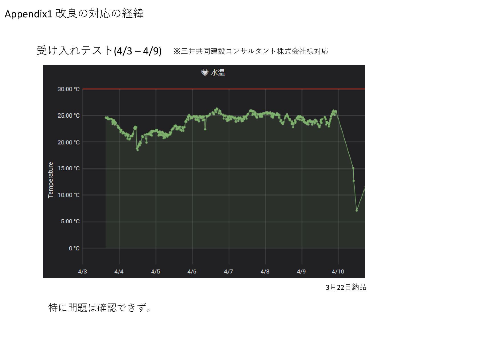 受け⼊れテスト(4/3 – 4/9) Appendix1 改良の対応の経緯 特に問題は確認できず。 3⽉22⽇納品 ※三井共同建設コンサルタント株式会社様対応