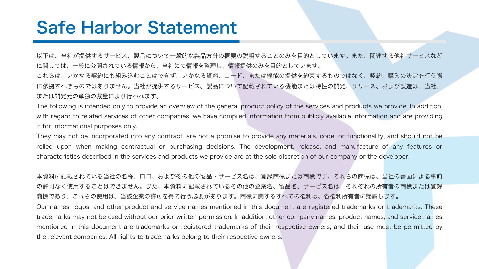 1. 4BGF)BSCPS4UBUFNFOU ҎԼ͸ɺ౰͕ࣾఏڙ͢ΔαʔϏεɺ੡඼ʹ͍ͭͯҰൠతͳ੡඼ํ਑ͷ֓ཁͷઆ໌͢Δ͜ͱͷΈΛ໨తͱ͍ͯ͠·͢ɻ·ͨɺؔ࿈͢ΔଞࣾαʔϏεͳͲ ʹؔͯ͠͸ɺҰൠʹެ։͞Ε͍ͯΔ৘ใ͔Βɺ౰ࣾʹͯ৘ใΛ੔ཧ͠ɺ৘ใఏڙͷΈΛ໨తͱ͍ͯ͠·͢ɻ ͜ΕΒ͸ɺ͍͔ͳΔܖ໿ʹ΋૊ΈࠐΉ͜ͱ͸Ͱ͖ͣɺ͍͔ͳΔࢿྉɺίʔυɺ·ͨ͸ػೳͷఏڙΛ໿ଋ͢Δ΋ͷͰ͸ͳ͘ɺܖ໿ɺߪೖͷܾఆΛߦ͏ࡍ ʹґڌ͢΂͖΋ͷͰ͸͋Γ·ͤΜɻ౰͕ࣾఏڙ͢ΔαʔϏεɺ੡඼ʹ͍ͭͯهࡌ͞Ε͍ͯΔػೳ·ͨ͸ಛੑͷ։ൃɺϦϦʔεɺ͓Αͼ੡଄͸ɺ౰ࣾɺ ·ͨ͸։ൃݩͷ୯ಠͷࡋྔʹΑΓߦΘΕ·͢ɻ 5IFGPMMPXJOHJTJOUFOEFEPOMZUPQSPWJEFBOPWFSWJFXPGUIFHFOFSBMQSPEVDUQPMJDZPGUIFTFSWJDFTBOEQSPEVDUTXFQSPWJEF*OBEEJUJPO  XJUISFHBSEUPSFMBUFETFSWJDFTPGPUIFSDPNQBOJFT XFIBWFDPNQJMFEJOGPSNBUJPOGSPNQVCMJDMZBWBJMBCMFJOGPSNBUJPOBOEBSFQSPWJEJOH