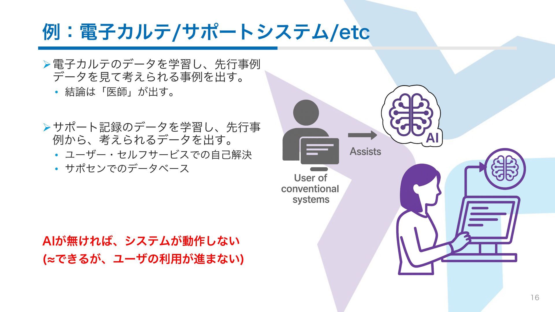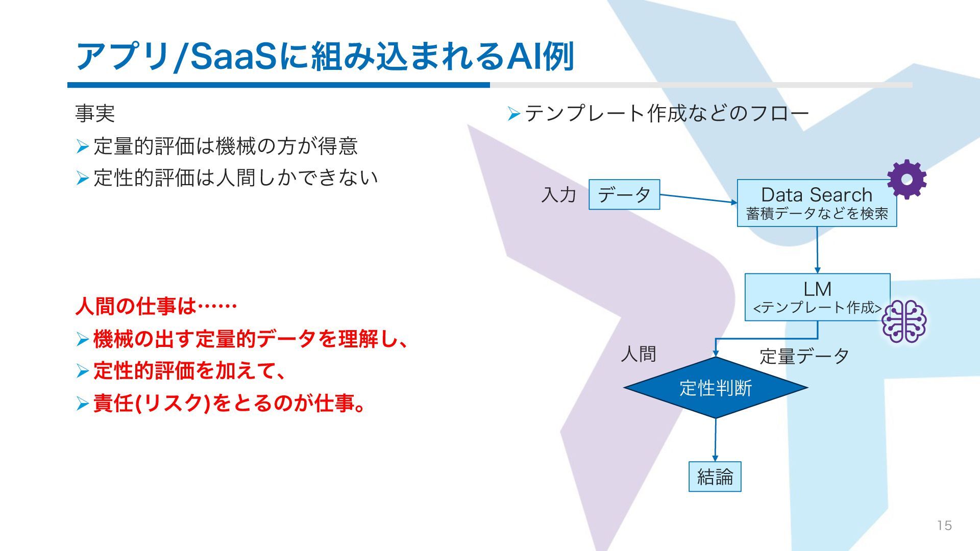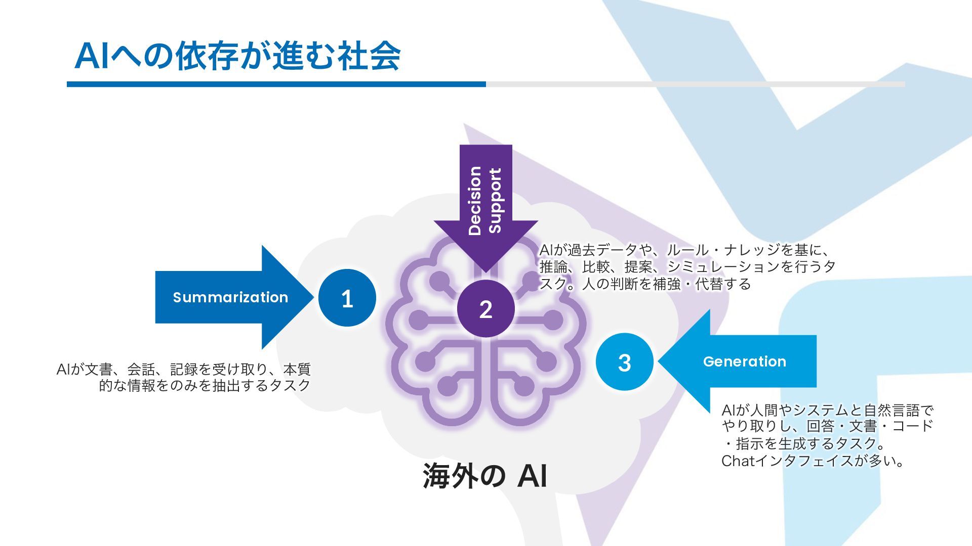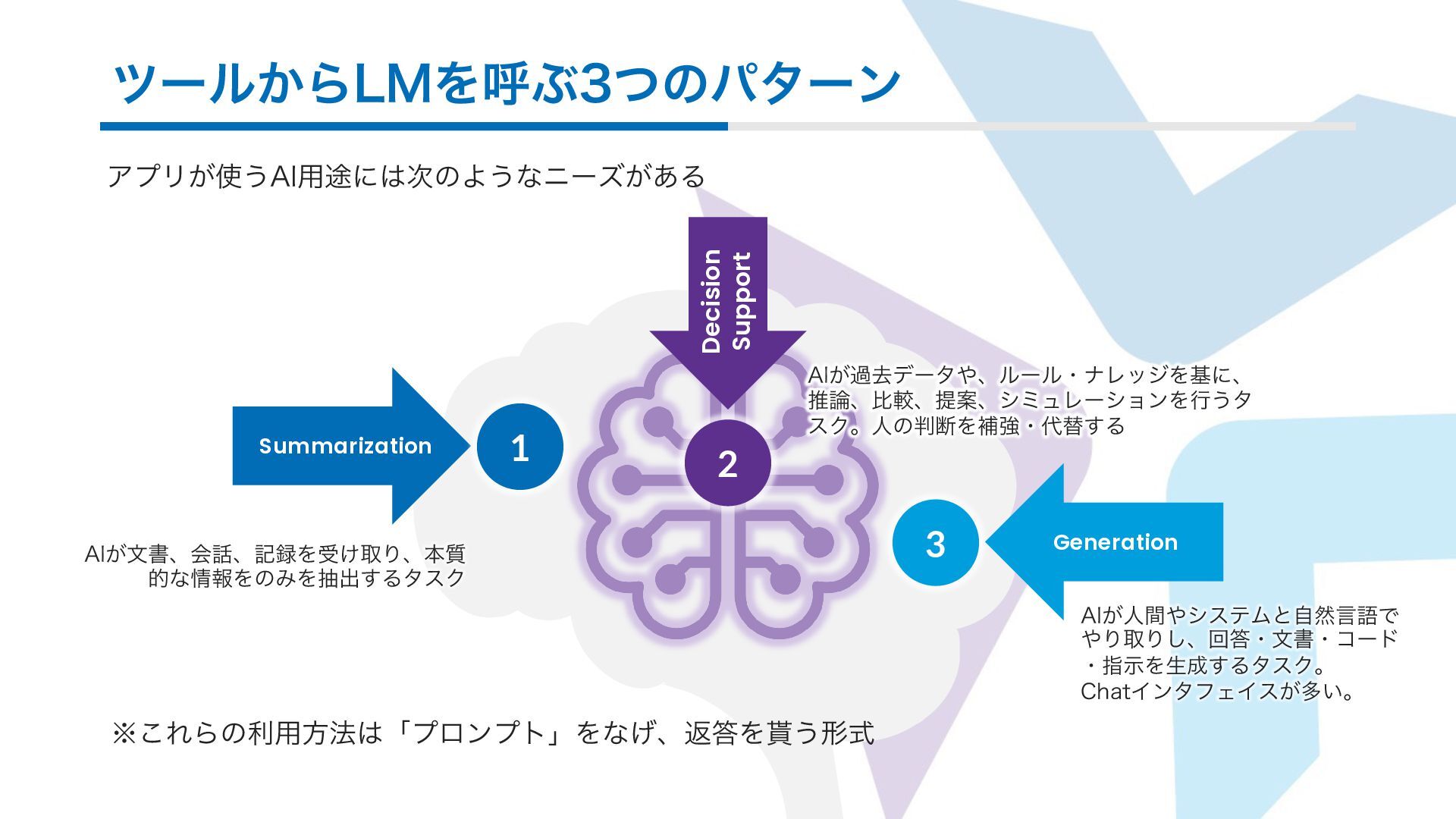 πʔϧ͔Β-.ΛݺͿͭͷύλʔϯ 2 Decision Support "*͕աڈσʔλ΍ɺϧʔϧɾφϨοδΛجʹɺ ਪ࿦ɺൺֱɺఏҊɺγϛϡϨʔγϣϯΛߦ͏λ εΫɻਓͷ൑அΛิڧɾ୅ସ͢Δ ˞͜ΕΒͷར༻ํ๏͸ʮϓϩϯϓτʯΛͳ͛ɺฦ౴Λ໯͏ܗࣜ ΞϓϦ͕࢖͏"*༻్ʹ͸࣍ͷΑ͏ͳχʔζ͕͋Δ