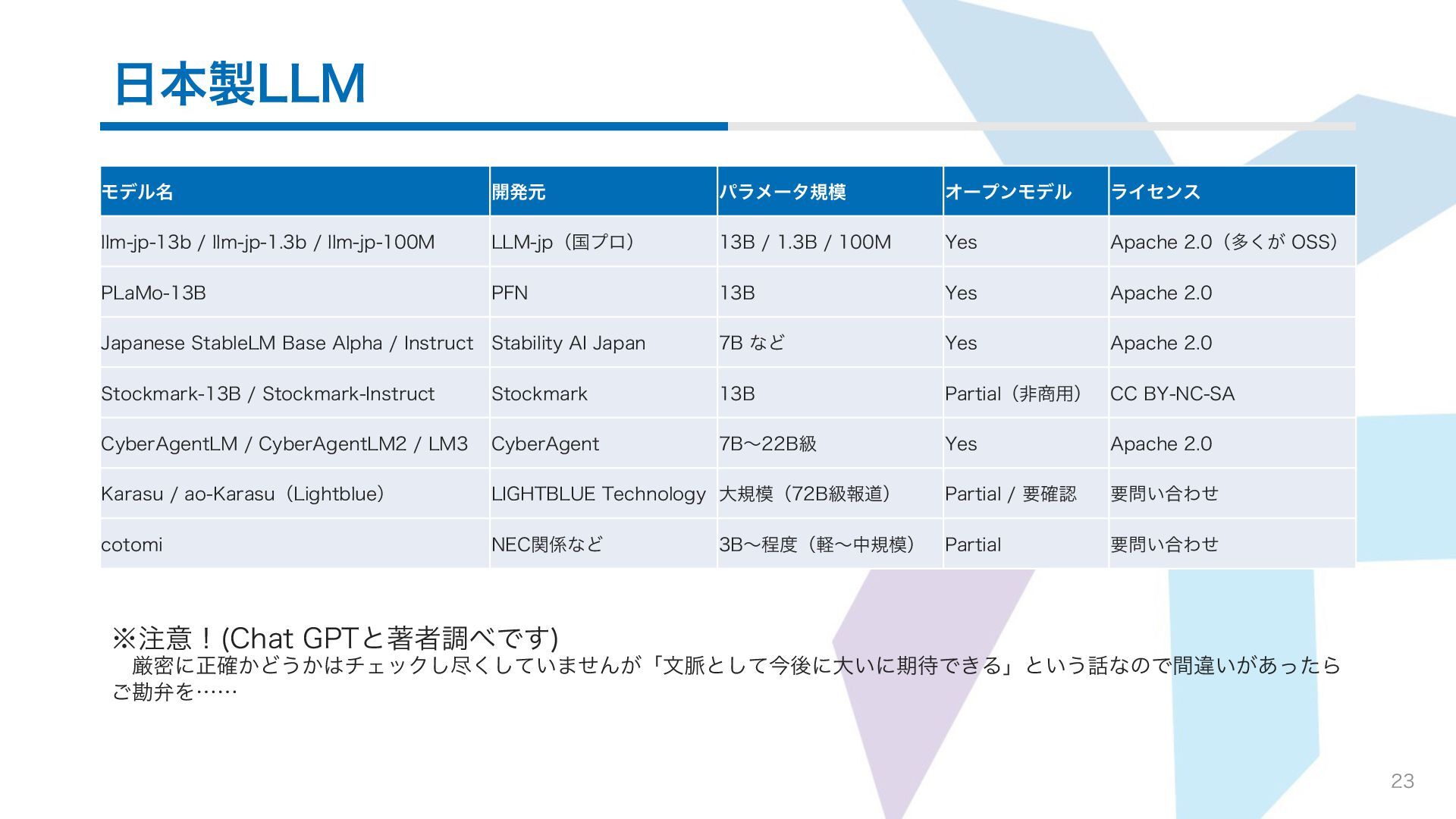 "QBDIFʢଟ͕͘ 044ʣ 1-B.P# 1'/ # :FT "QBDIF +BQBOFTF4UBCMF-.#BTF"MQIB*OTUSVDU 4UBCJMJUZ"*+BQBO #ͳͲ :FT "QBDIF 4UPDLNBSL#4UPDLNBSL*OTUSVDU 4UPDLNBSL # 1BSUJBMʢඇ঎༻ʣ $$#:/$4" $ZCFS"HFOU-.$ZCFS"HFOU-.-. $ZCFS"HFOU #ʙ#ڃ :FT "QBDIF ,BSBTVBP,BSBTVʢ-JHIUCMVFʣ -*()5#-6&5FDIOPMPHZ େن໛ʢ#ڃใಓʣ 1BSUJBMཁ֬ೝ ཁ໰͍߹Θͤ DPUPNJ /&$ؔ܎ͳͲ #ʙఔ౓ʢܰʙதن໛ʣ 1BSUJBM ཁ໰͍߹Θͤ  ˞஫ҙʂ $IBU(15ͱஶऀௐ΂Ͱ͢ ݫີʹਖ਼͔֬Ͳ͏͔͸νΣοΫ͠ਚ͍ͯ͘͠·ͤΜ͕ʮจ຺ͱͯ͠ࠓޙʹେ͍ʹظ଴Ͱ͖Δʯͱ͍͏࿩ͳͷͰؒҧ͍͕͋ͬͨΒ ͝צหΛʜʜ