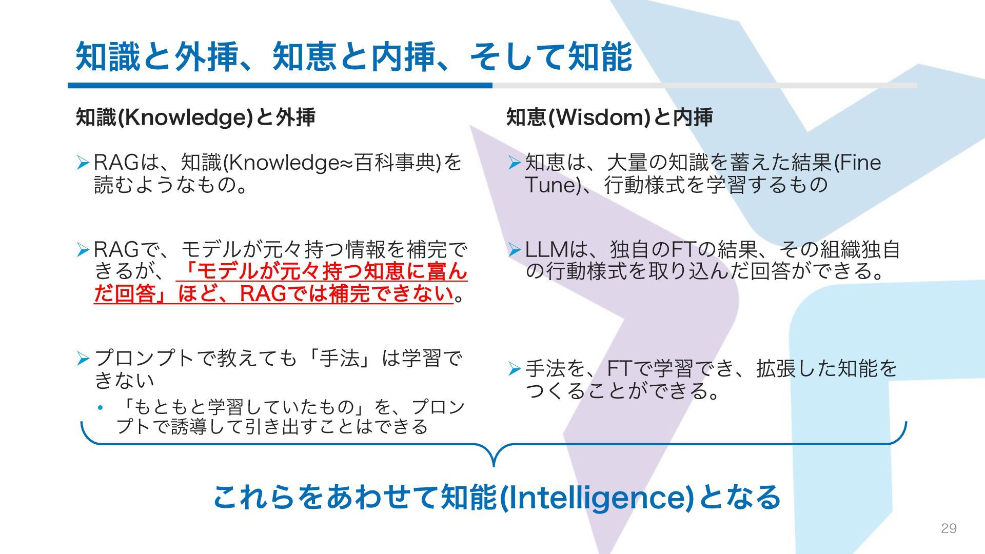 Λ ಡΉΑ͏ͳ΋ͷɻ Ø3"(ͰɺϞσϧ͕ݩʑ࣋ͭ৘ใΛิ׬Ͱ ͖Δ͕ɺʮϞσϧ͕ݩʑ࣋ͭ஌ܙʹ෋Μ ͩճ౴ʯ΄Ͳɺ3"(Ͱ͸ิ׬Ͱ͖ͳ͍ɻ ØϓϩϯϓτͰڭ͑ͯ΋ʮख๏ʯ͸ֶशͰ ͖ͳ͍ • ʮ΋ͱ΋ͱֶश͍ͯͨ͠΋ͷʯΛɺϓϩϯ ϓτͰ༠ಋͯ͠Ҿ͖ग़͢͜ͱ͸Ͱ͖Δ Ø஌ܙ͸ɺେྔͷ஌ࣝΛ஝͑ͨ݁Ռ 'JOF 5VOF ɺߦಈ༷ࣜΛֶश͢Δ΋ͷ Ø--.͸ɺಠࣗͷ'5ͷ݁Ռɺͦͷ૊৫ಠࣗ ͷߦಈ༷ࣜΛऔΓࠐΜͩճ౴͕Ͱ͖Δɻ Øख๏Λɺ'5ͰֶशͰ͖ɺ֦ுͨ͠஌ೳΛ ͭ͘Δ͜ͱ͕Ͱ͖Δɻ ͜ΕΒΛ͋Θͤͯ஌ೳ *OUFMMJHFODF ͱͳΔ