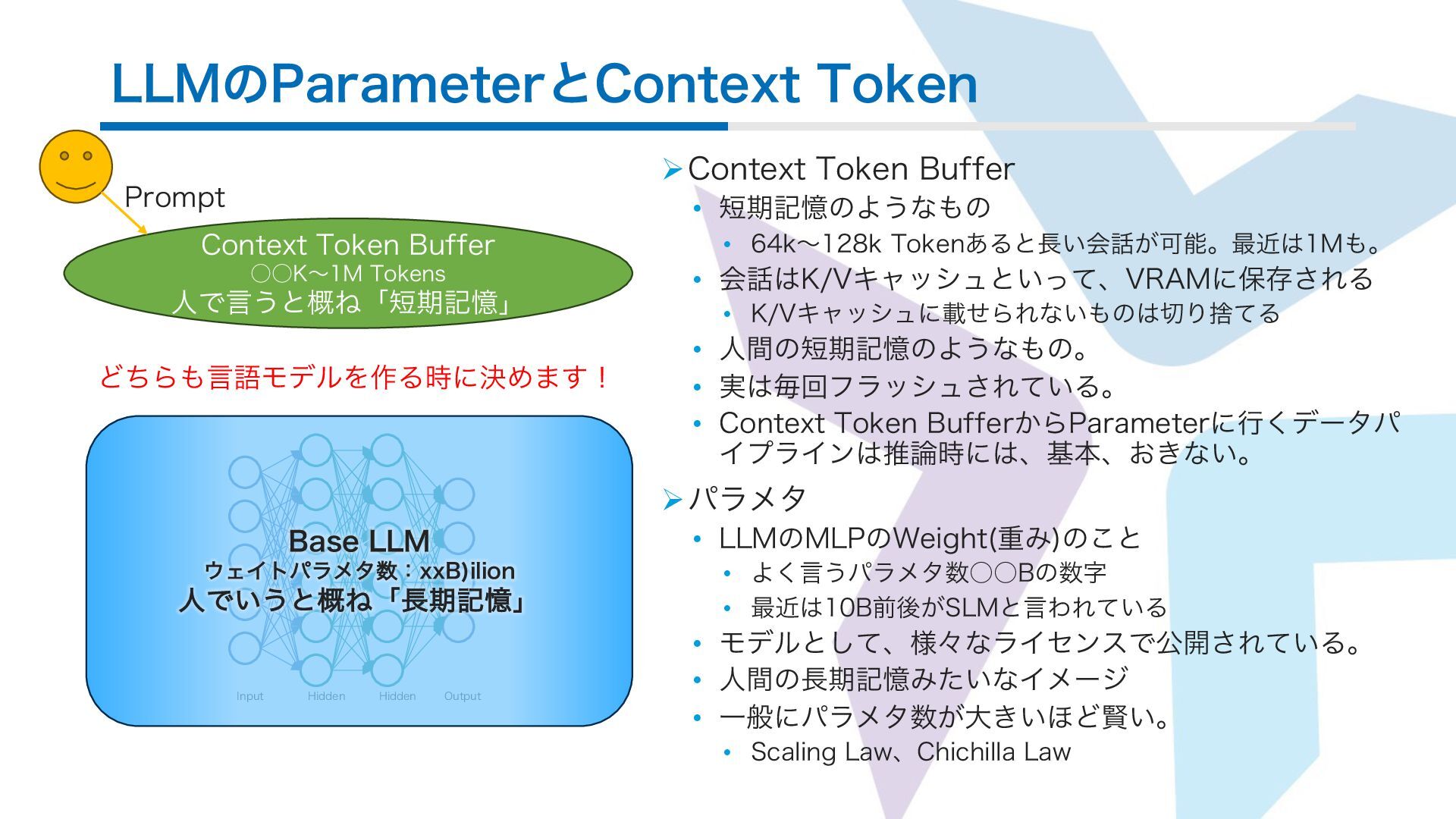 ,7ΩϟογϡʹࡌͤΒΕͳ͍΋ͷ͸੾ΓࣺͯΔ • ਓؒͷ୹ظهԱͷΑ͏ͳ΋ͷɻ • ࣮͸ຖճϑϥογϡ͞Ε͍ͯΔɻ • $POUFYU5PLFO#VGGFS͔Β1BSBNFUFSʹߦ͘σʔλύ ΠϓϥΠϯ͸ਪ࿦࣌ʹ͸ɺجຊɺ͓͖ͳ͍ɻ Øύϥϝλ • --.ͷ.-1ͷ8FJHIU ॏΈ ͷ͜ͱ • Α͘ݴ͏ύϥϝλ਺˓˓#ͷ਺ࣈ • ࠷ۙ͸#લޙ͕4-.ͱݴΘΕ͍ͯΔ • Ϟσϧͱͯ͠ɺ༷ʑͳϥΠηϯεͰެ։͞Ε͍ͯΔɻ • ਓؒͷ௕ظهԱΈ͍ͨͳΠϝʔδ • Ұൠʹύϥϝλ਺͕େ͖͍΄Ͳݡ͍ɻ • 4DBMJOH-BXɺ$IJDIJMMB -BX $POUFYU5PLFO#VGGFS ˓˓,ʙ.5PLFOT ਓͰݴ͏ͱ֓Ͷʮ୹ظهԱʯ 1SPNQU ͲͪΒ΋ݴޠϞσϧΛ࡞Δ࣌ʹܾΊ·͢ʂ *OQVU )JEEFO )JEEFO 0VUQVU #BTF--. ΢ΣΠτύϥϝλ਺ɿYY# JMJPO ਓͰ͍͏ͱ֓Ͷʮ௕ظهԱʯ