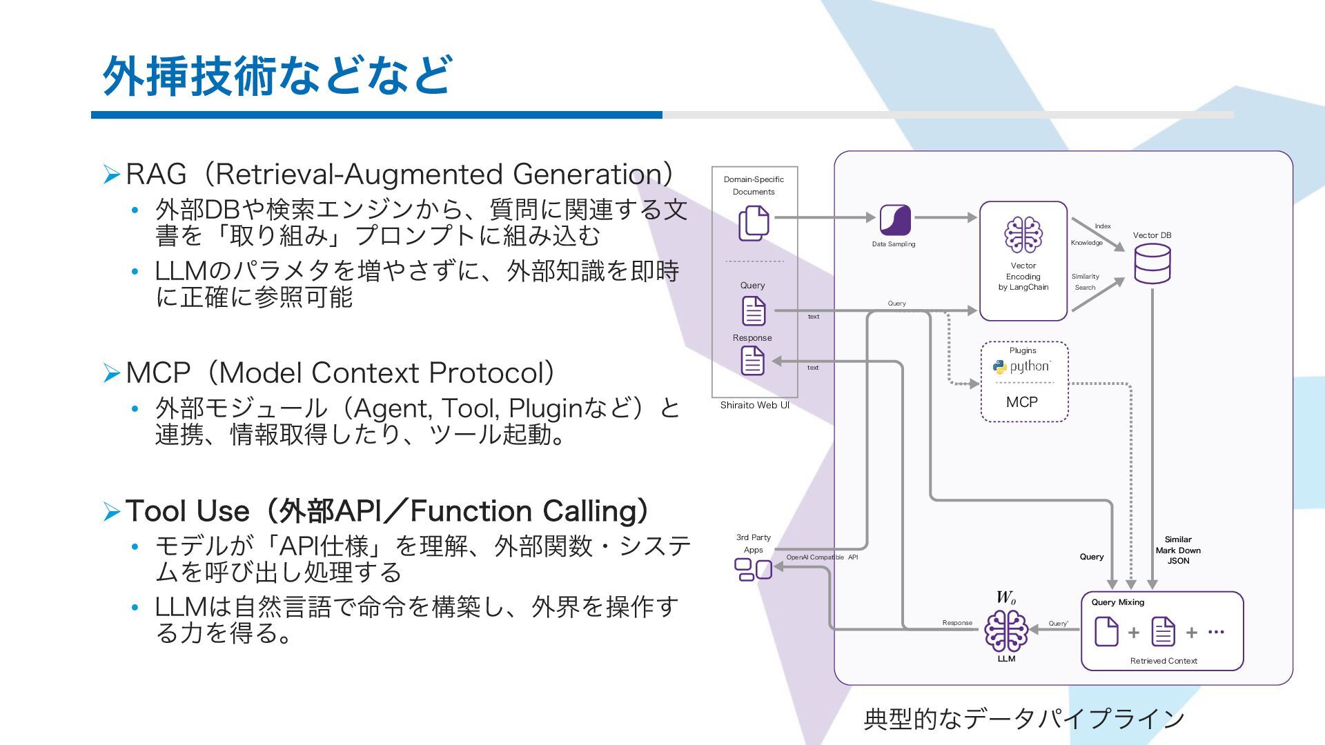 ֎෦Ϟδϡʔϧʢ"HFOU 5PPM 1MVHJOͳͲʣͱ ࿈ܞɺ৘ใऔಘͨ͠Γɺπʔϧىಈɻ Ø5PPM6TFʢ֎෦"1*ʗ'VODUJPO$BMMJOHʣ • Ϟσϧ͕ʮ"1*࢓༷ʯΛཧղɺ֎෦ؔ਺ɾγες ϜΛݺͼग़͠ॲཧ͢Δ • --.͸ࣗવݴޠͰ໋ྩΛߏங͠ɺ֎քΛૢ࡞͢ ΔྗΛಘΔɻ UFYU UFYU %PNBJO4QFDJpD %PDVNFOUT %BUB4BNQMJOH 2VFSZ SE1BSUZ "QQT 7FDUPS &ODPEJOH CZ-BOH$IBJO 7FDUPS%# 2VFSZ *OEFY ,OPXMFEHF 3FUSJFWFE$POUFYU 0QFO"*$PNQBUJCMF"1* ┛ ⓴ 4JNJMBS .BSL%PXO +40/ 3FTQPOTF --. 3FTQPOTF 4JNJMBSJUZ 4FBSDI 4IJSBJUP8FC6* 1MVHJOT .$1 2VFSZ 2VFSZ.JYJOH 2VFSZ` ʴ ʴ ɾɾɾ యܕతͳσʔλύΠϓϥΠϯ